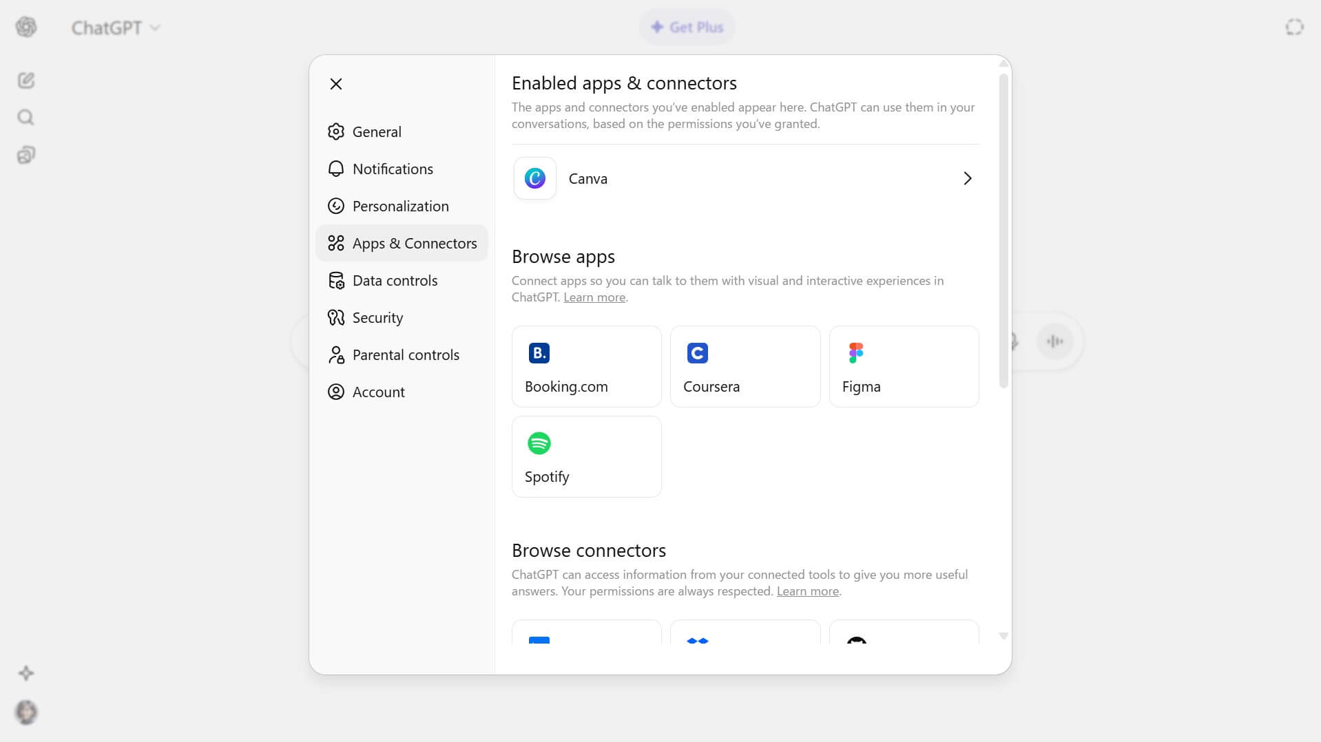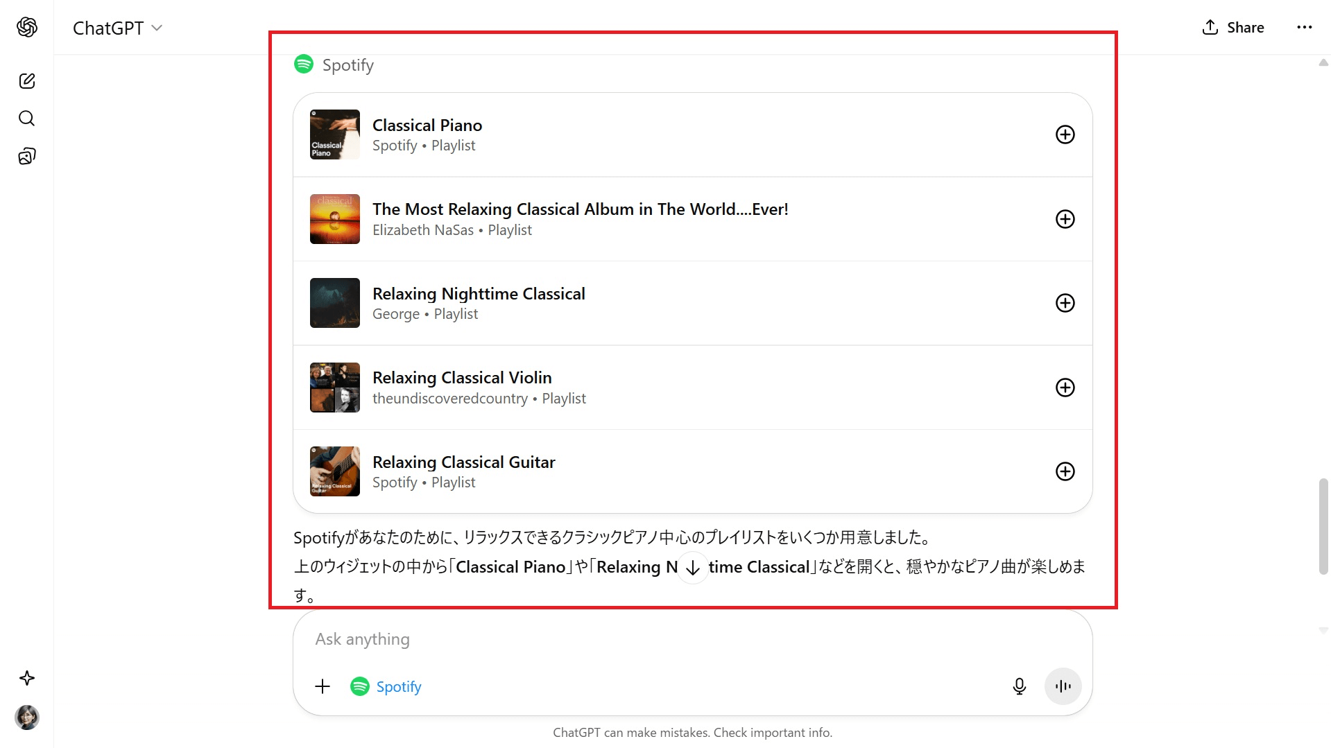 ユーザーは、この機能を使ってアプリを追加・連携することで、音楽再生やデザイン作成、情報検索などをチャット内でシームレスに行うことが可能になります。