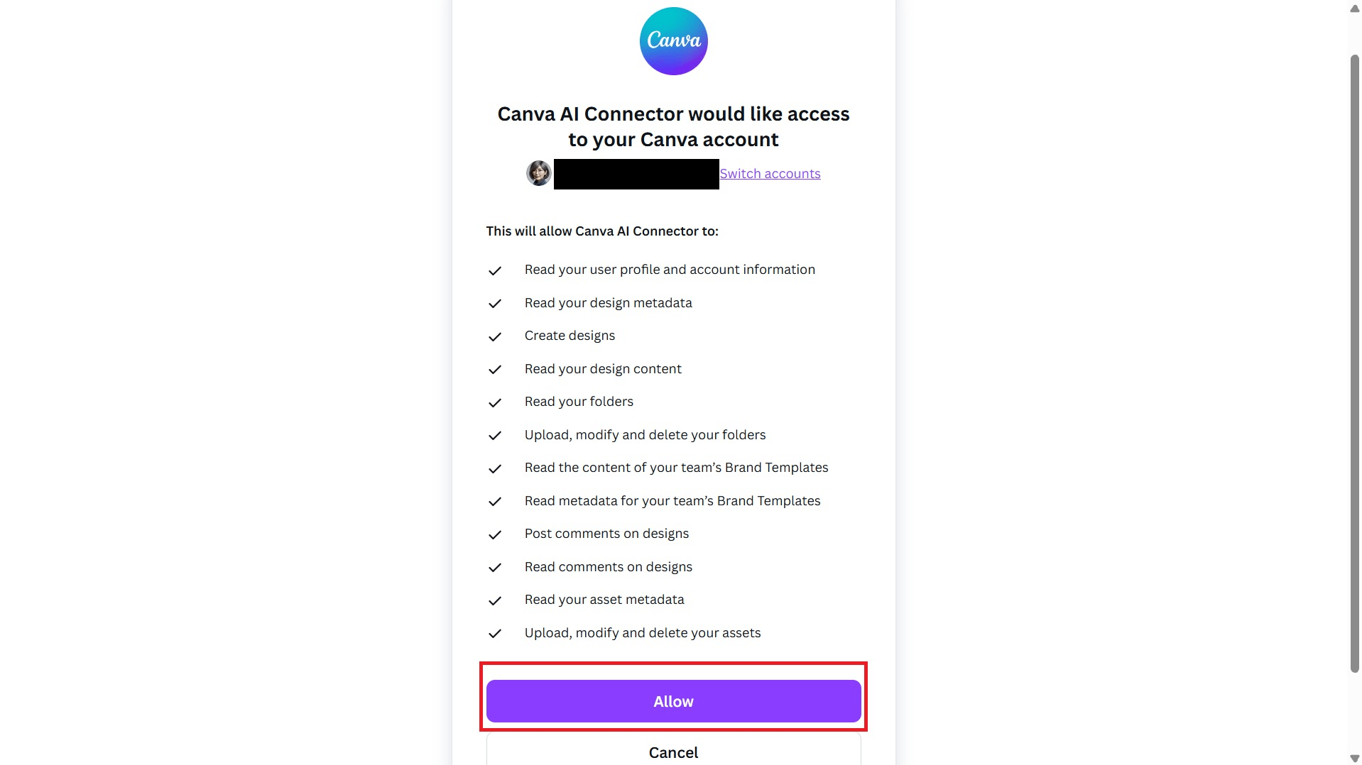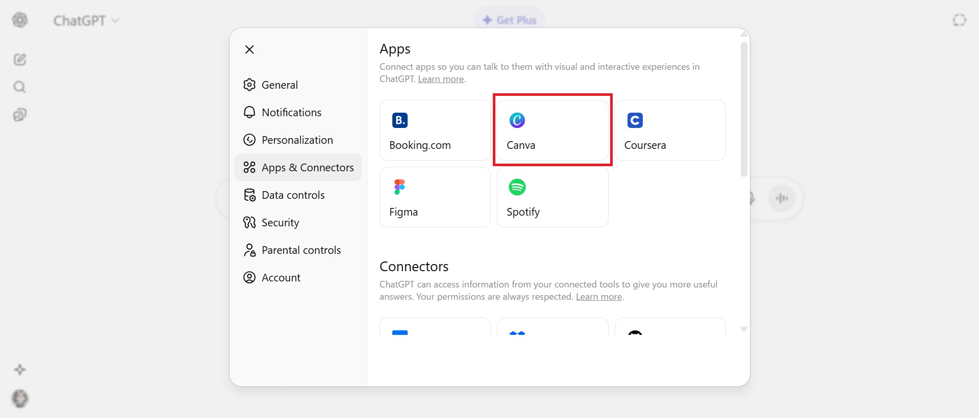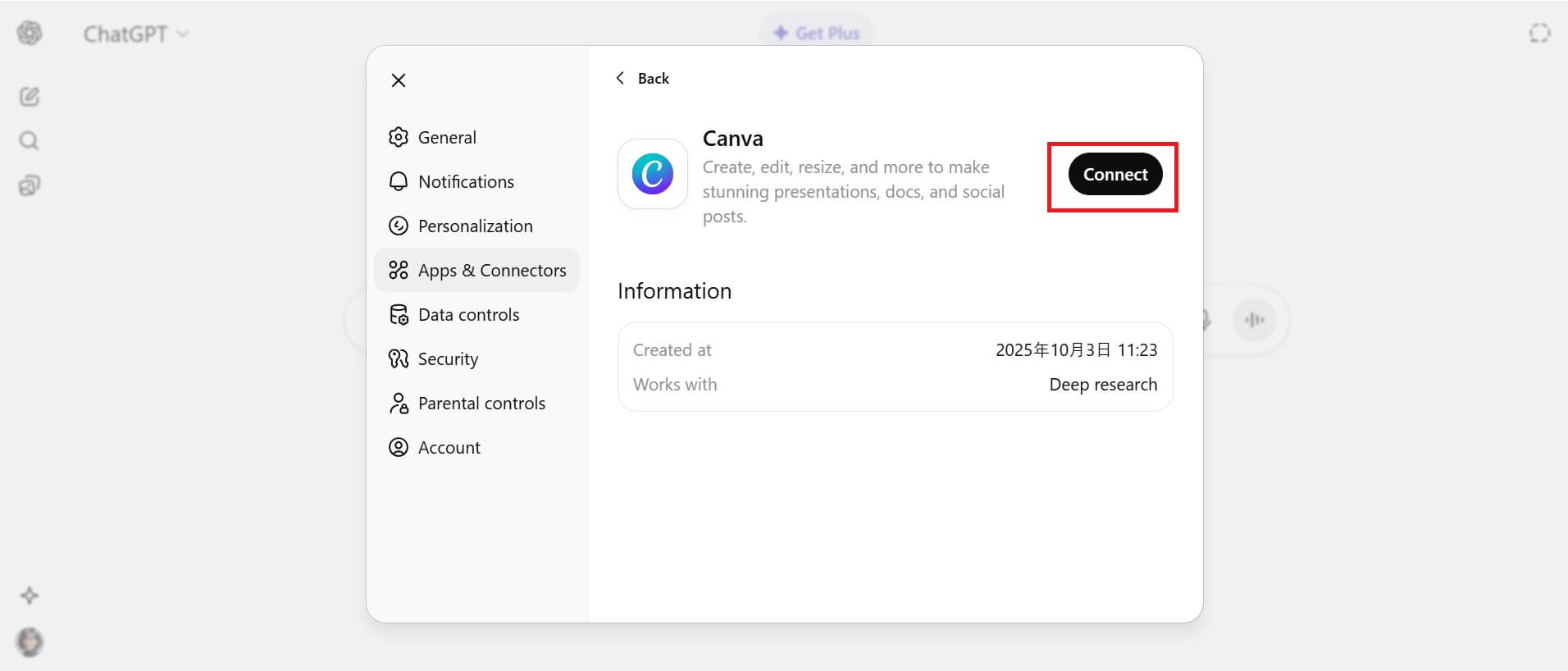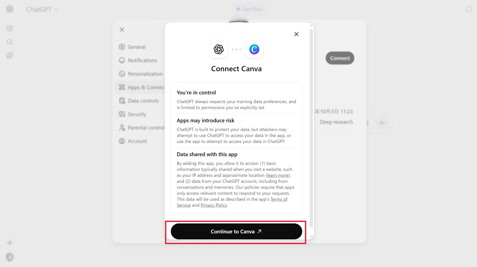 ChatGPT側でCanvaを選択し、表示された画面でConnectをクリックして、指示に従います。