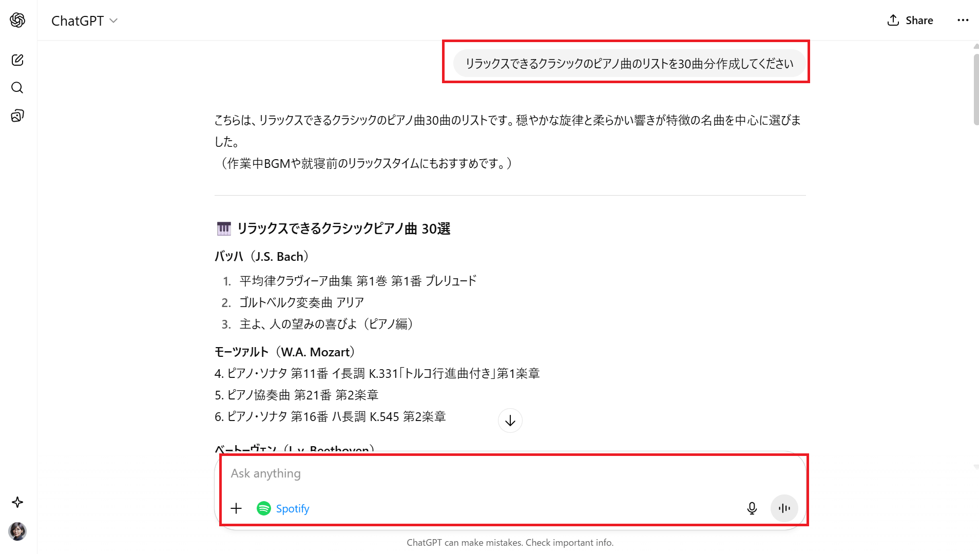 Spotifyなら「リラックスできる音楽のプレイリストを作って」と指示するだけです。