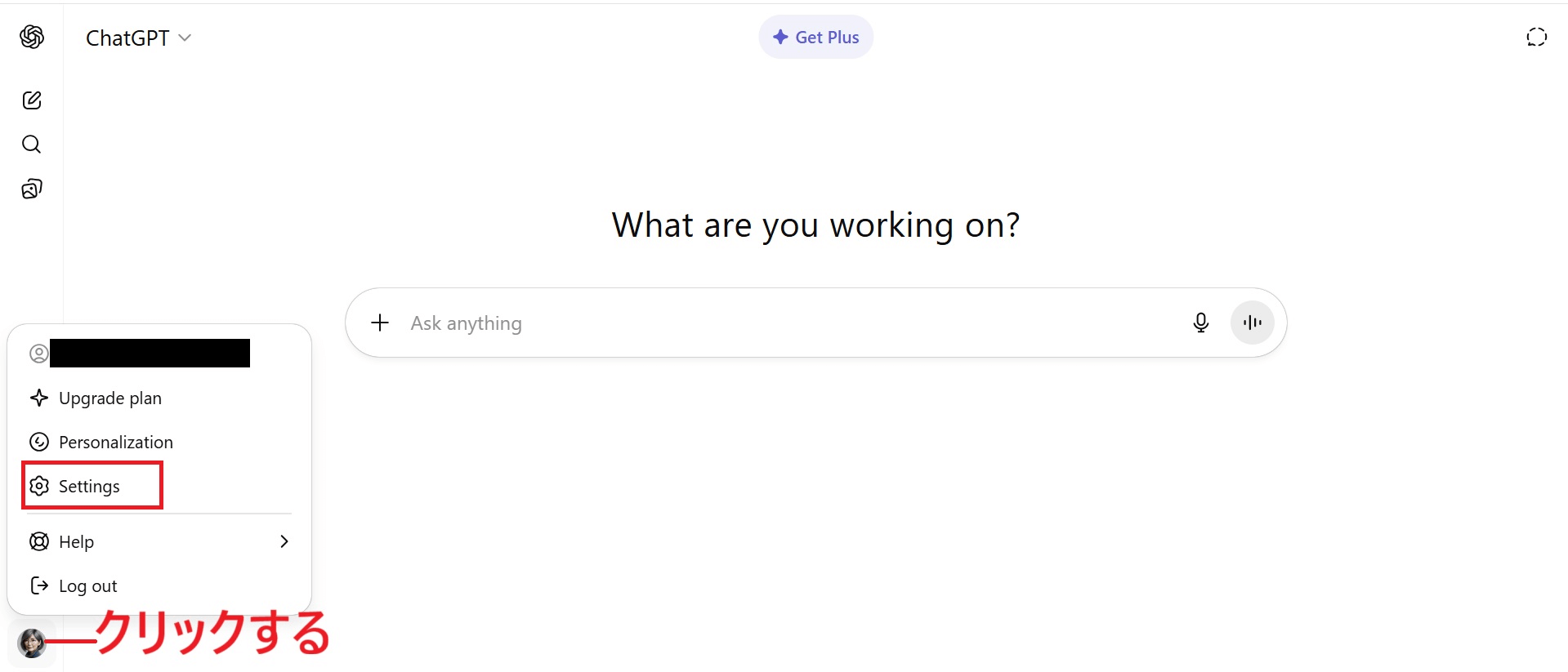 ChatGPTの左下隅のアカウント表示箇所をクリックし、設定(Settings)を選択します。