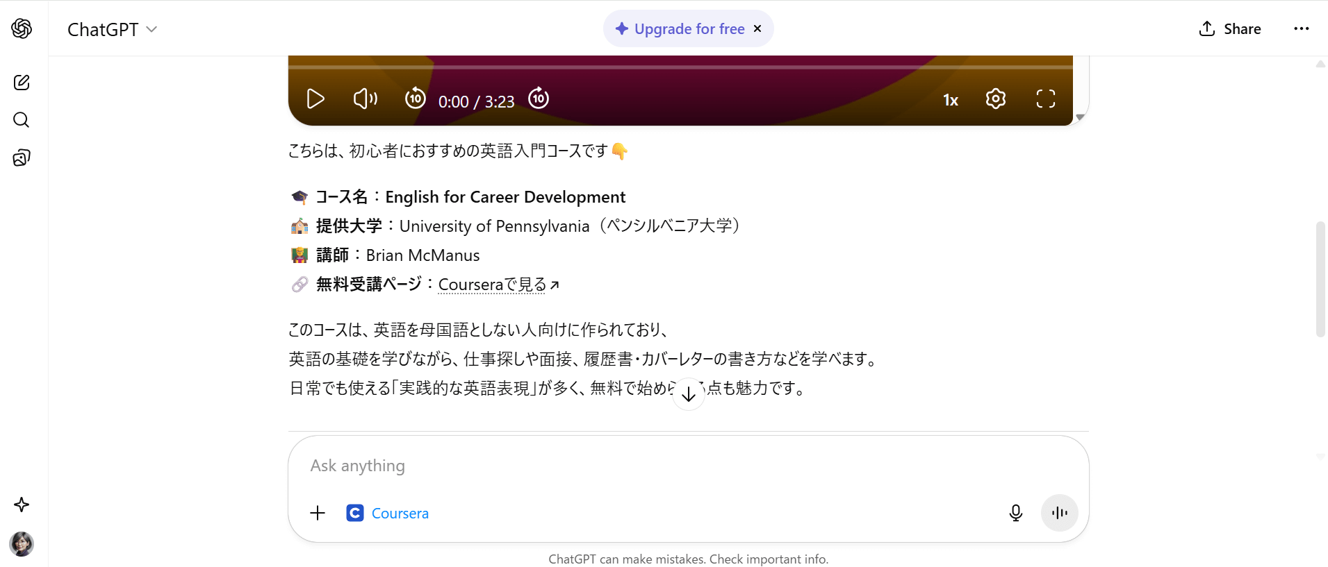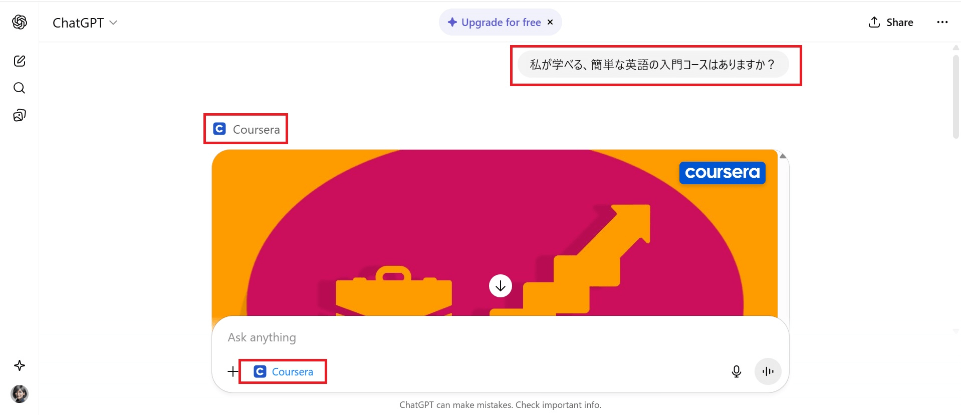 たとえばCourseraなら、「簡単な英語の入門コースがありますか?」と尋ねるだけで、おすすめのコースを案内してくれます。
