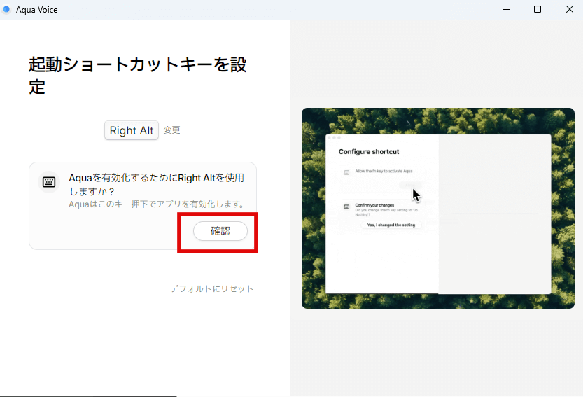 Aqua Voiceを起動するためのショートカットキーを設定する画面になります。初期推奨は他の操作と競合しにくい「Right Alt(右Altキー)」です。