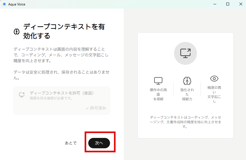 ディープコンテキスト(画面上の内容を深く理解する)はデフォルトで許可する設定になっています。