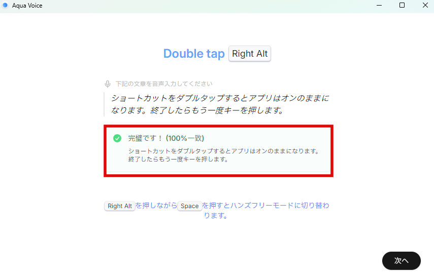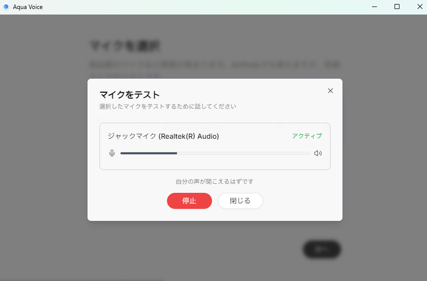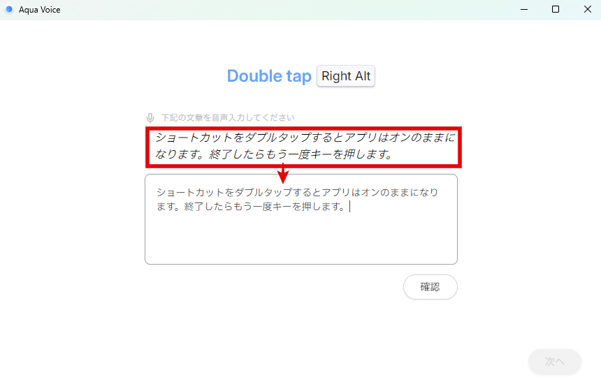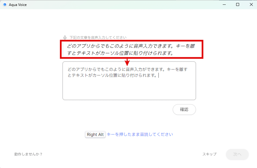 起動用ショートカットキー(ここでは初期設定の右Altキー)をダブルタップし、Aqua Voiceが起動すると音声入力テストが表示されます。