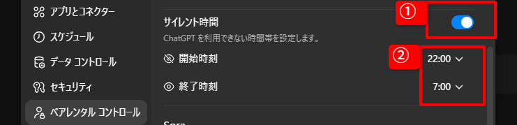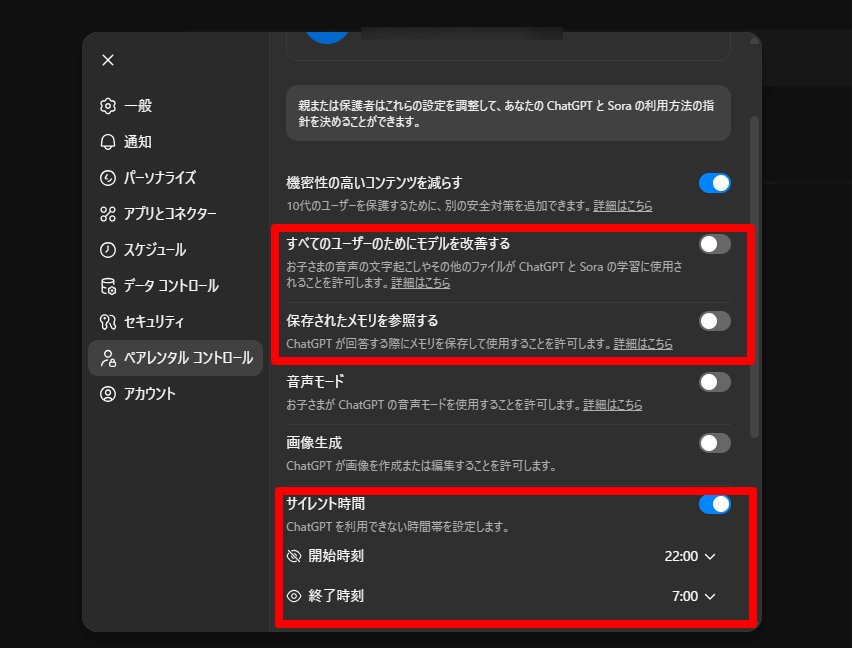 | 利用時間制限 | 「サイレント時間」でChatGPTを利用できない時間を設定 | ON | 使いすぎや夜間の利用を防ぎ、生活リズムを守る |