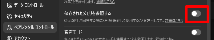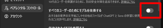 また、ChatGPTが学習データとして会話内容を利用する仕組みを理解するのが難しい年齢です。「すべてのユーザーのためにモデルを改善する」をOFFにしておくことで、プライバシーを守りつつ、安全な環境を保てます。