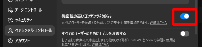 中学生(13〜15歳頃)は、AIが生成する情報の真偽を自分で判断する力がまだ十分に育っていません。そのため、誤情報や過激な内容から距離を取れるよう、「機密性の高いコンテンツを減らす」をONに設定しておくことが大切です。