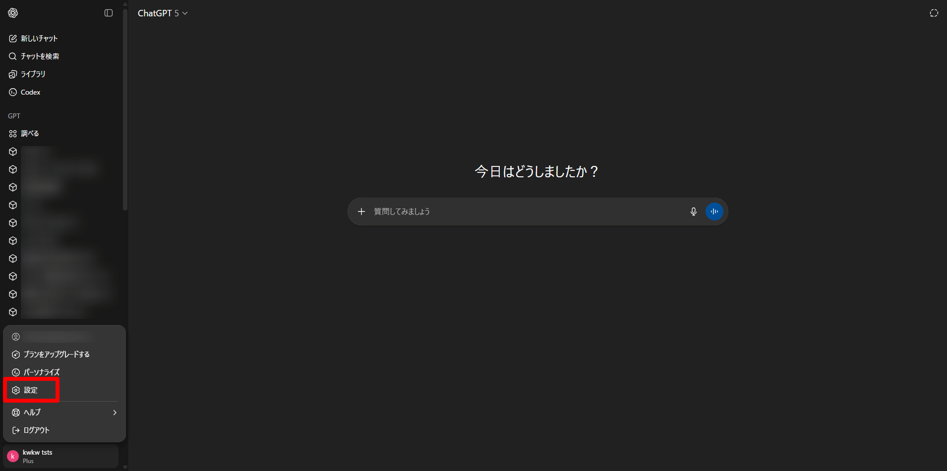 保護者のChatGPTアカウントにログイン後、画面左下(またはメニュー内)にある「設定」に進みます。