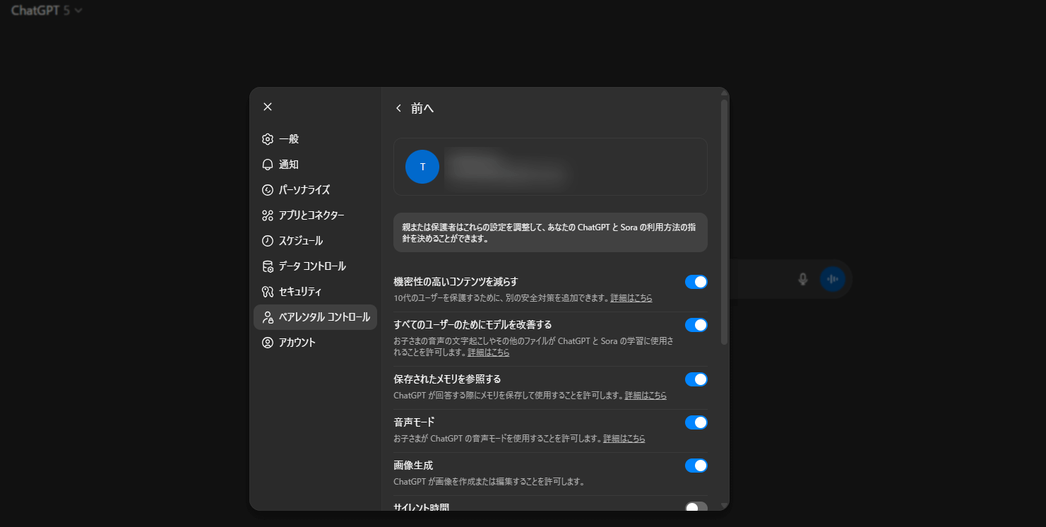 この機能を使うことで、保護者は見せたくない内容(センシティブな内容)やChatGPTを使う時間、音声や画像の機能を柔軟に設定できます。