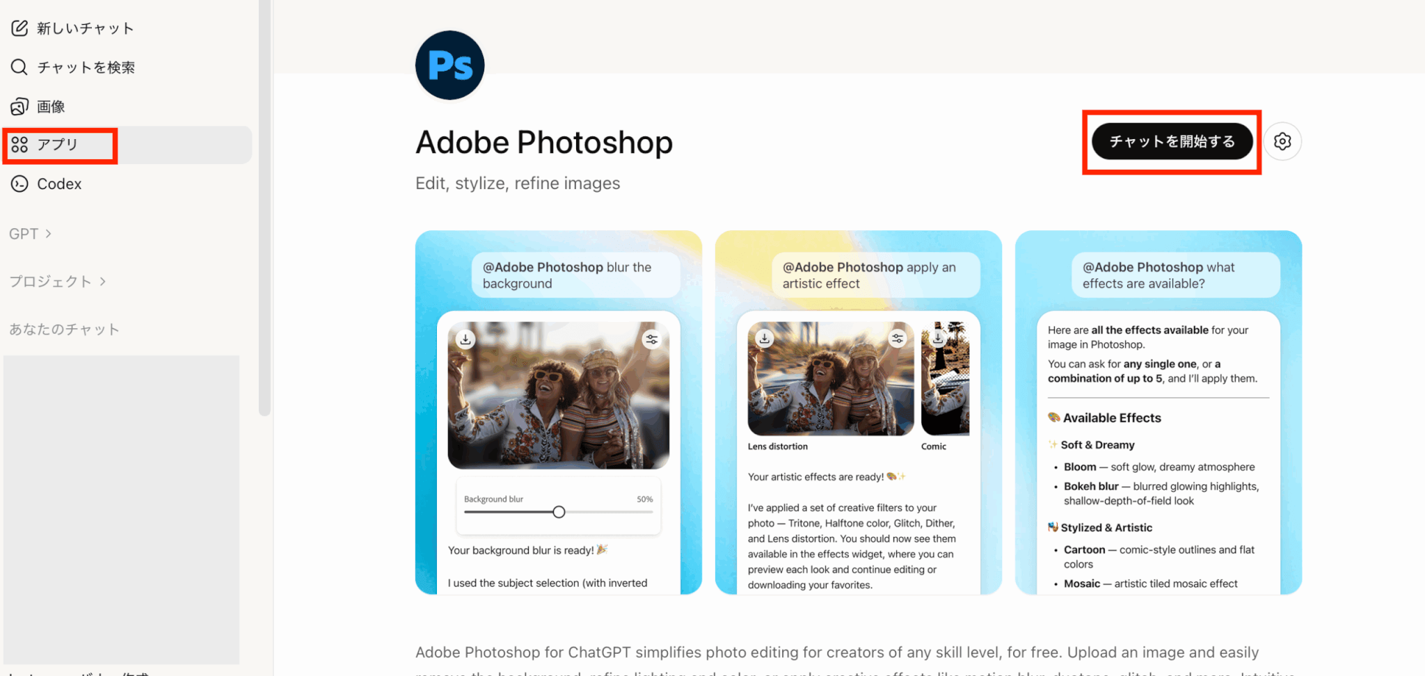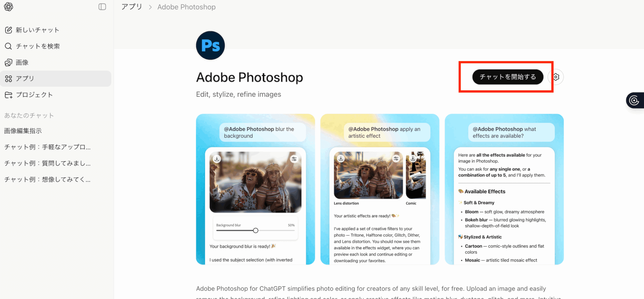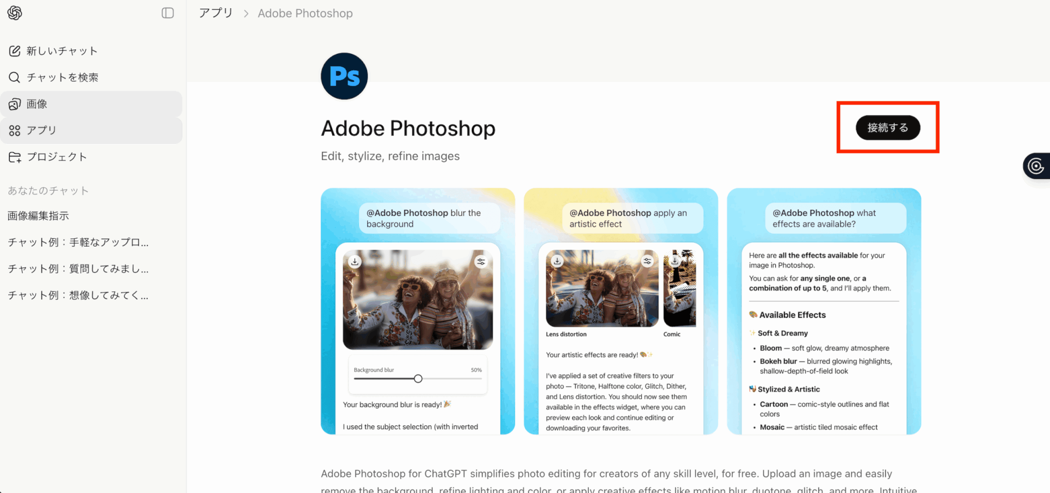 また、ChatGPT上で実行できる編集は、対応しているPhotoshop機能に限られます。