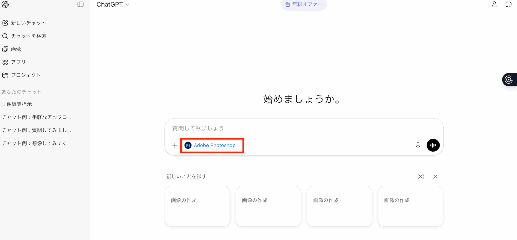 チャット入力欄に「Adobe Photoshop」というラベルが表示されていれば、Photoshopが有効になった状態です。