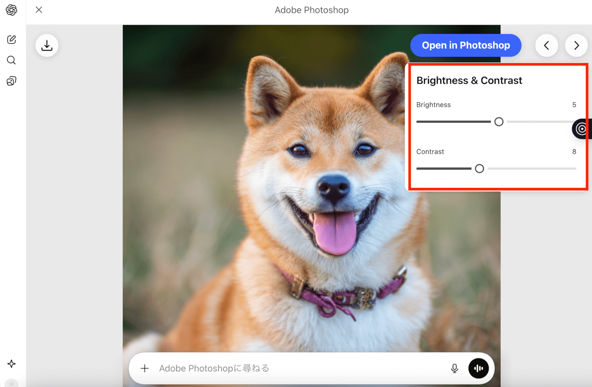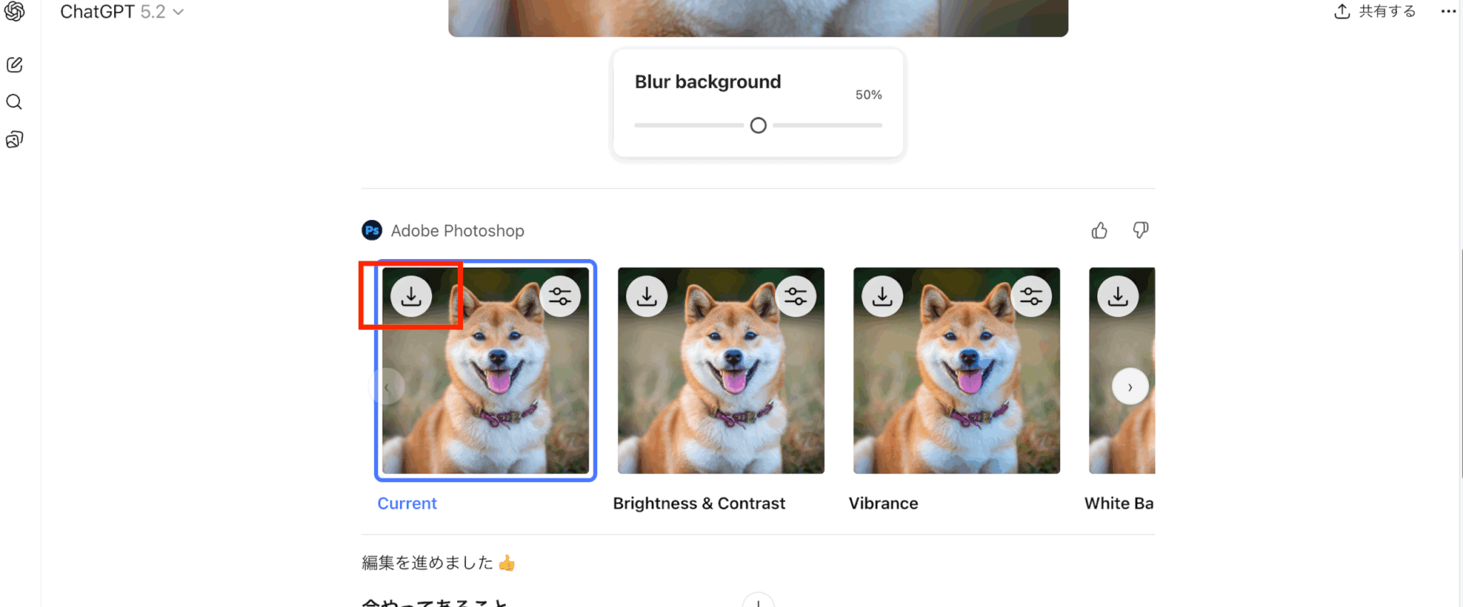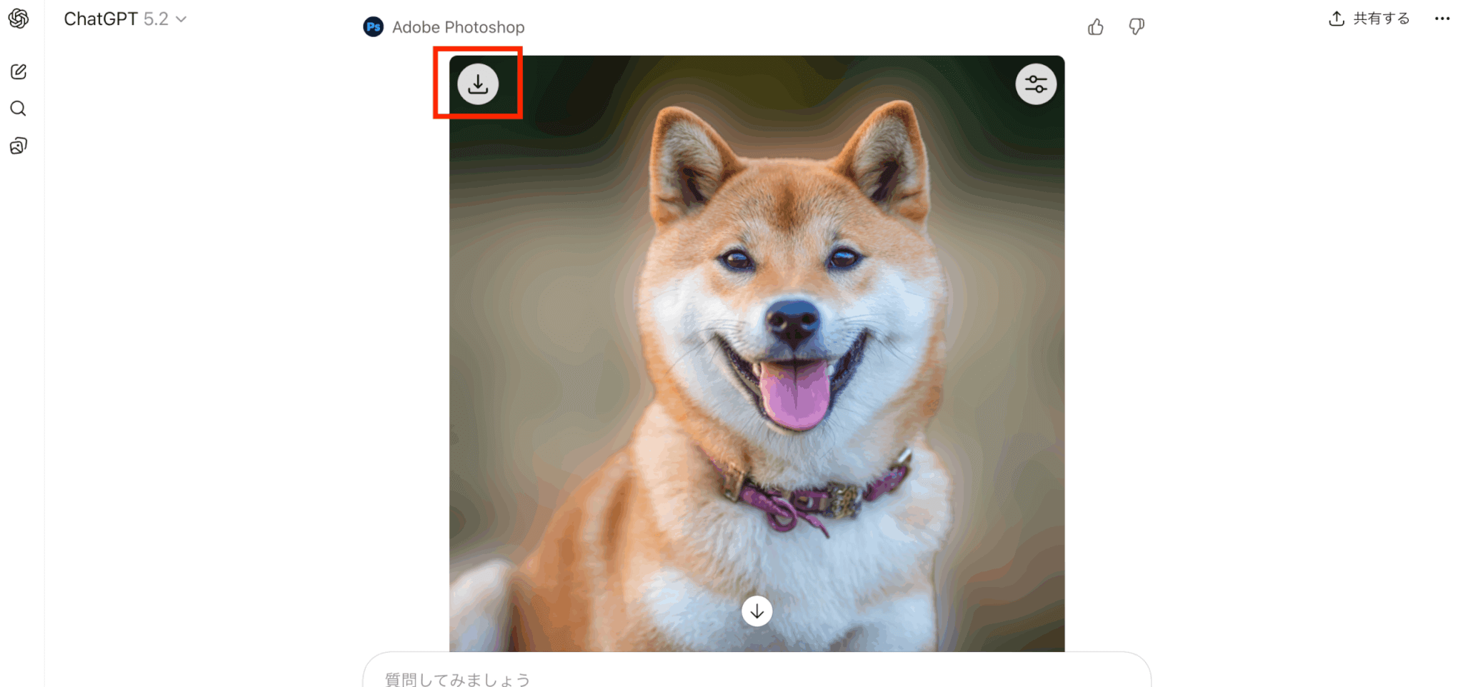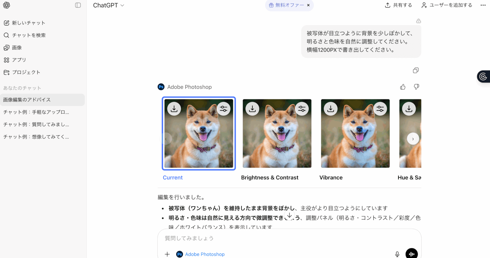 指示を送信すると、Photoshopの機能を使った編集結果がChatGPT上に表示されます。