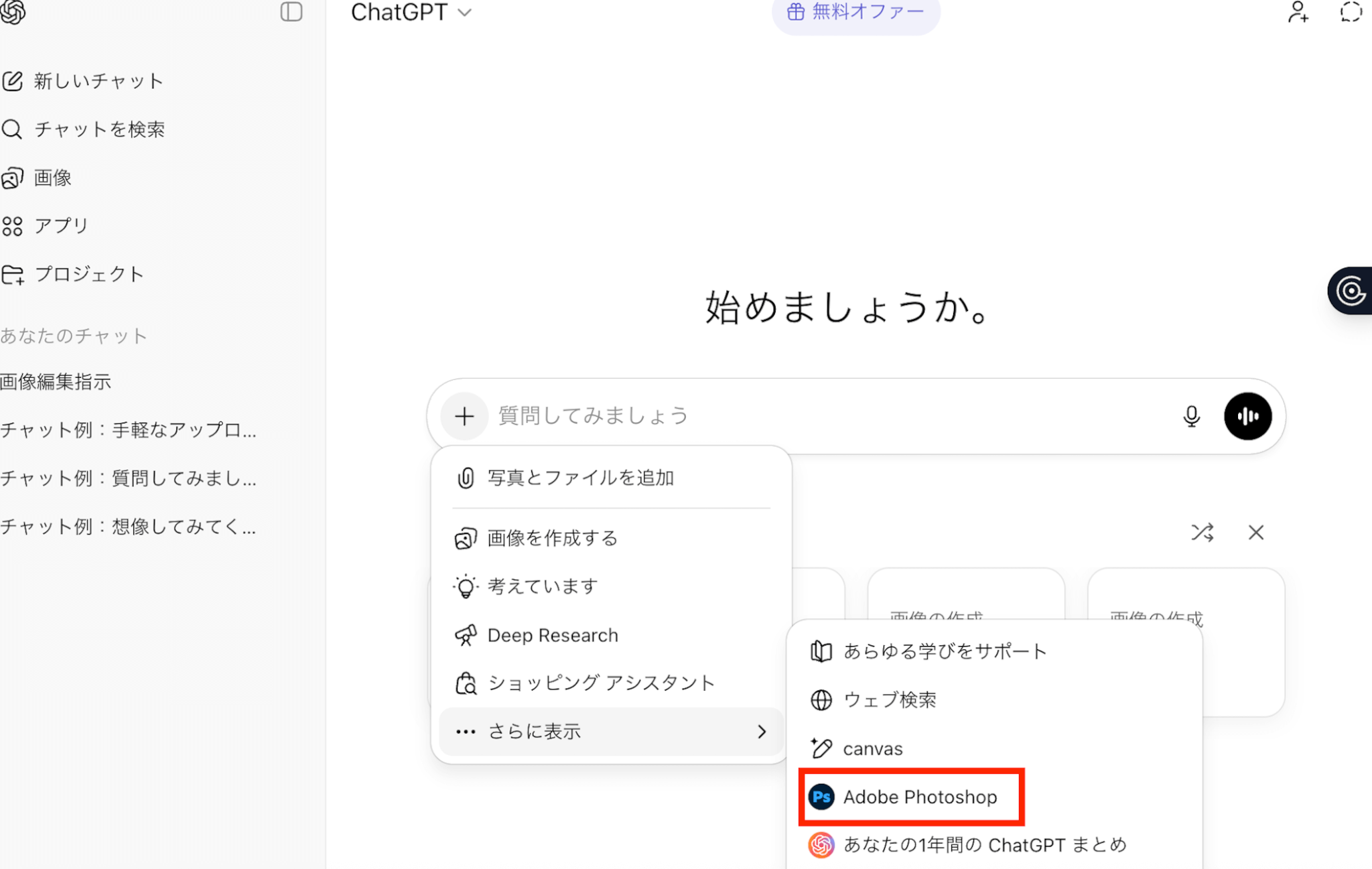チャット入力欄の左側にある 「+」ボタン をクリックし、「Adobe Photoshop」を選択します。