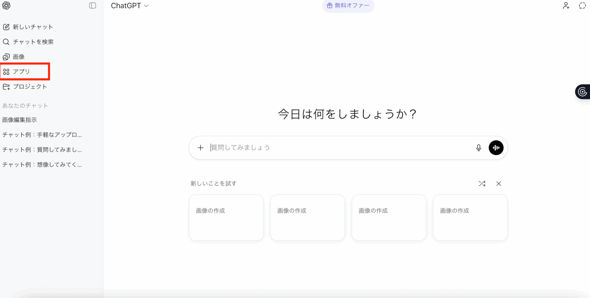 まずは、ChatGPT画面左側の サイドバーにある「アプリ」 をクリックします。