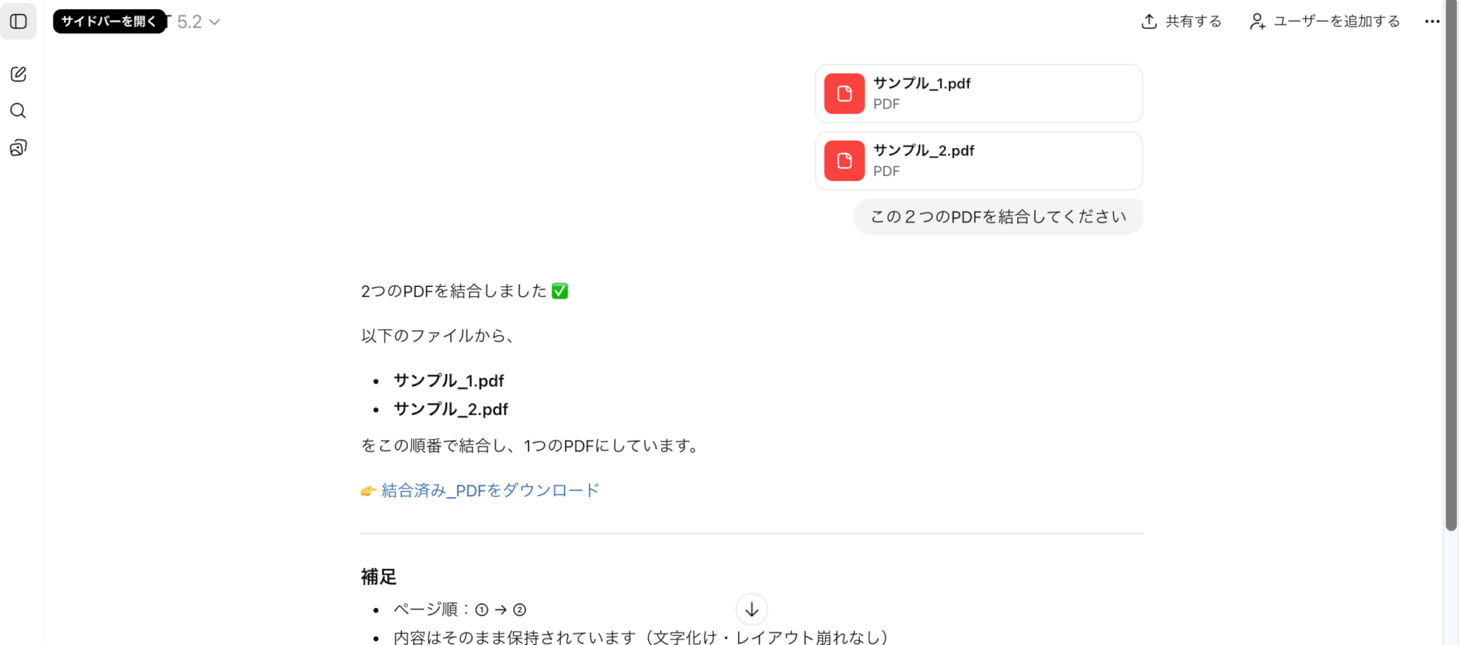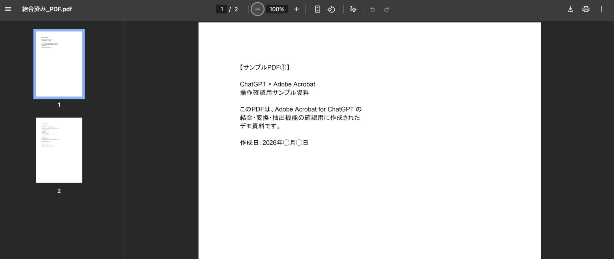 処理自体はChatGPTの画面内で完結しますが、結合後や変換後のPDFをChatGPT上で開いて確認することはできません。結果の確認は、ダウンロード後にPDFビューアで行う流れになります。
