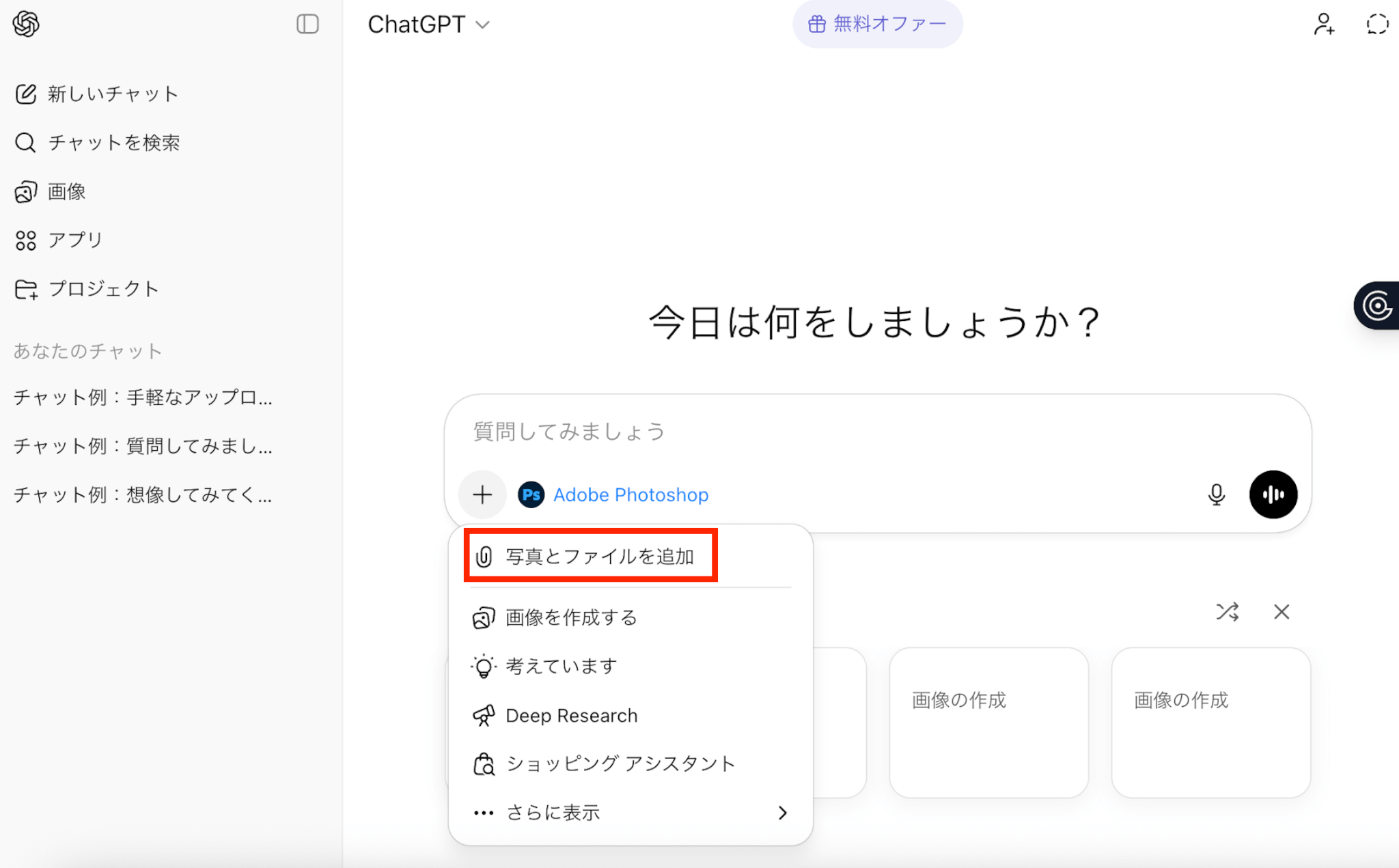 画像はPhotoshopが呼び出された状態のチャット内に追加してください。
