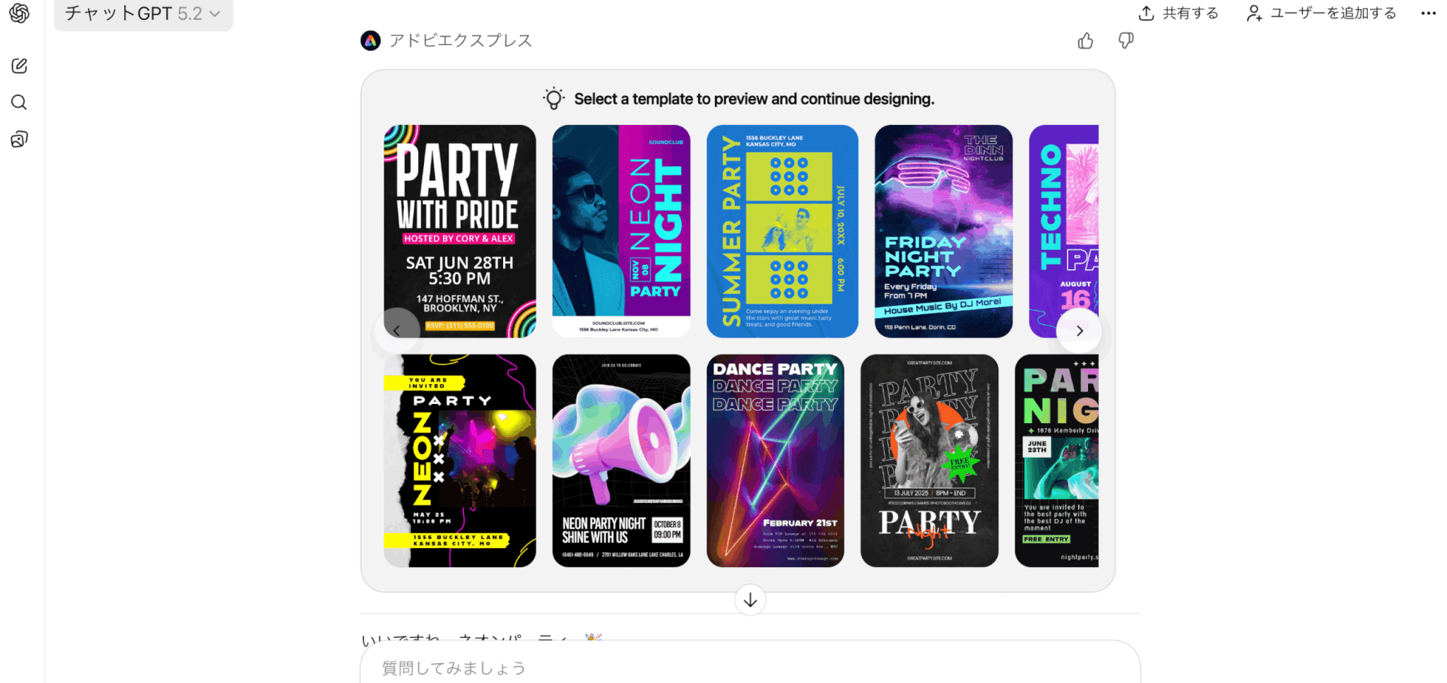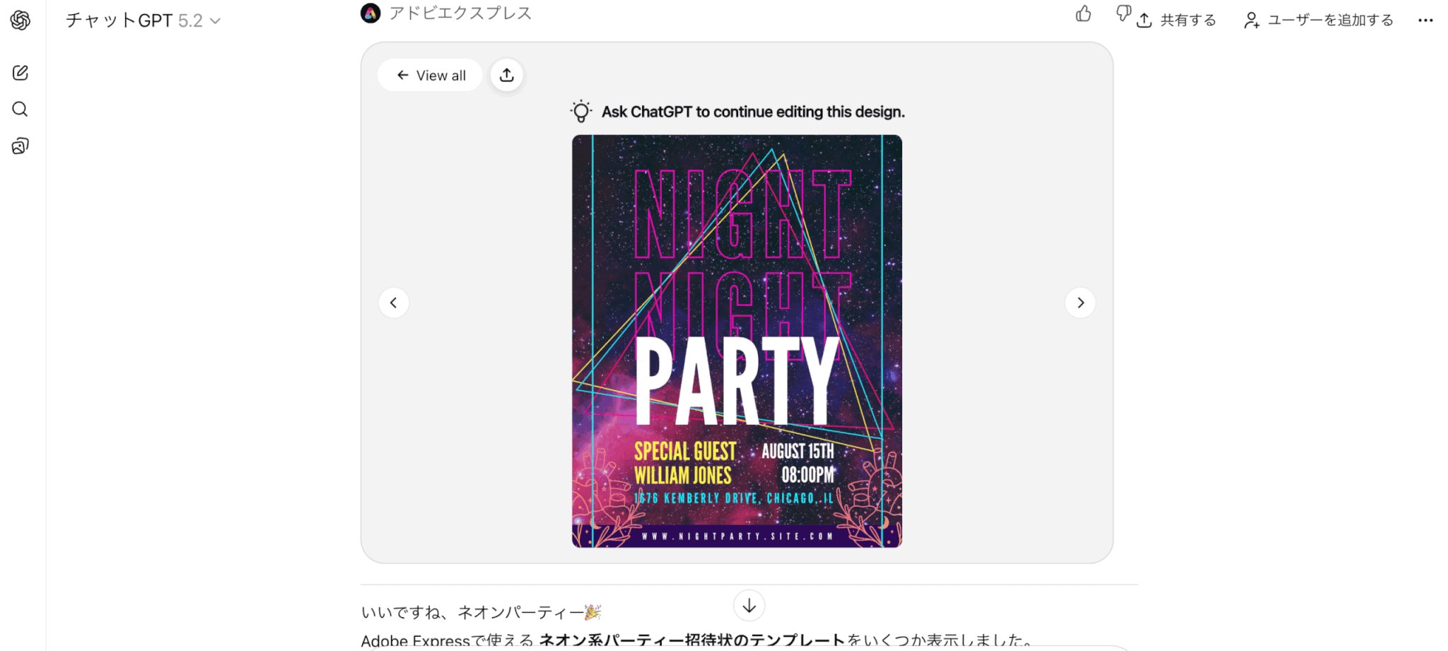 基本はChatGPT上でデザイン生成・編集を進め、仕上げとしてAdobe Express側で行間や文字サイズを整えるとスムーズです。