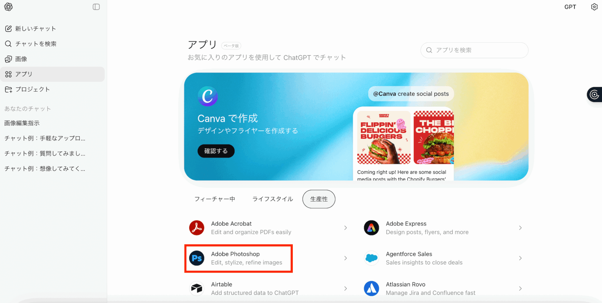 2026年1月時点では、Adobe Apps for ChatGPTで、Photoshop、Adobe Express、Acrobatが連携対象です。