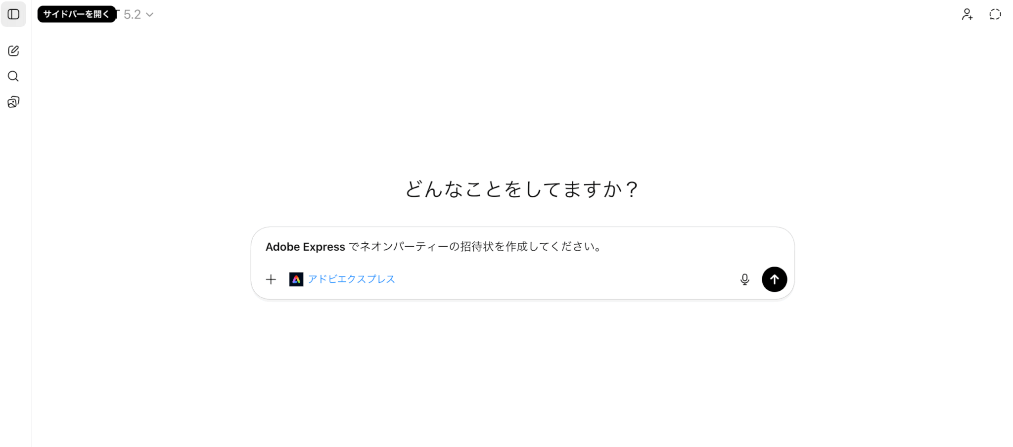 サイドバーの「アプリ」から「チャットを開始する」の文字が表示されているのか、チャット欄「+」にAdobeアプリが表示されているのかを確認しましょう。