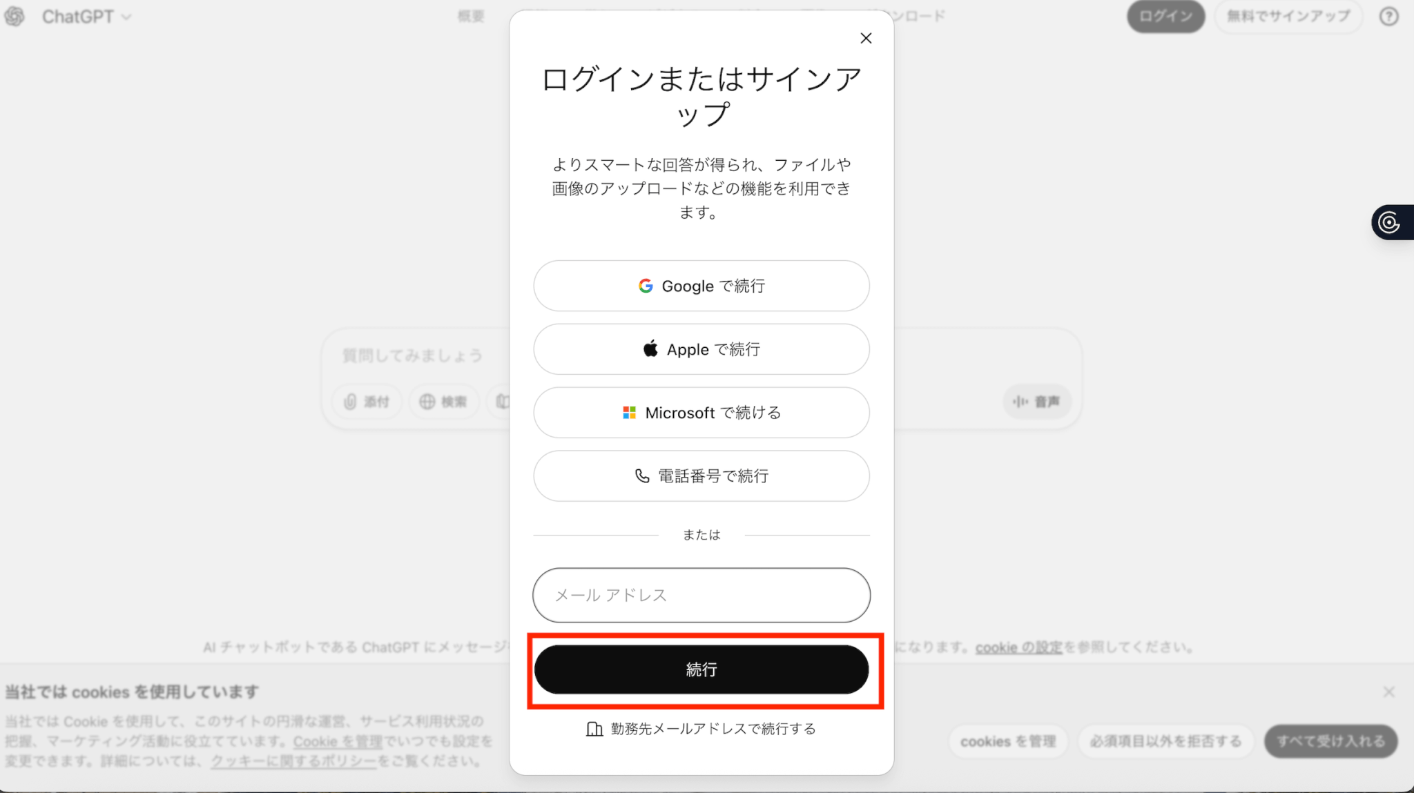 画面右側に表示される 「接続する」 または 「続行」 をクリックします。