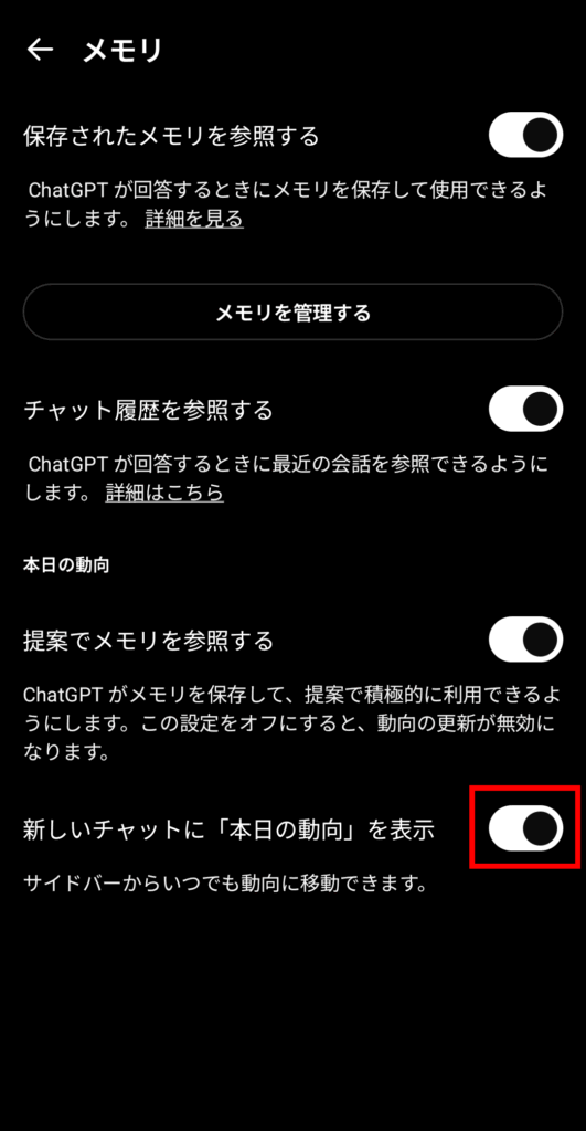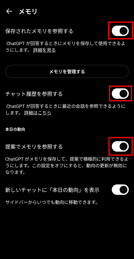「保存されたメモリを参照する」「チャット履歴を参照する」「提案でメモリを参照する」を有効にします。