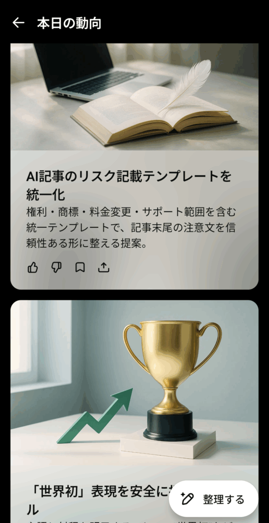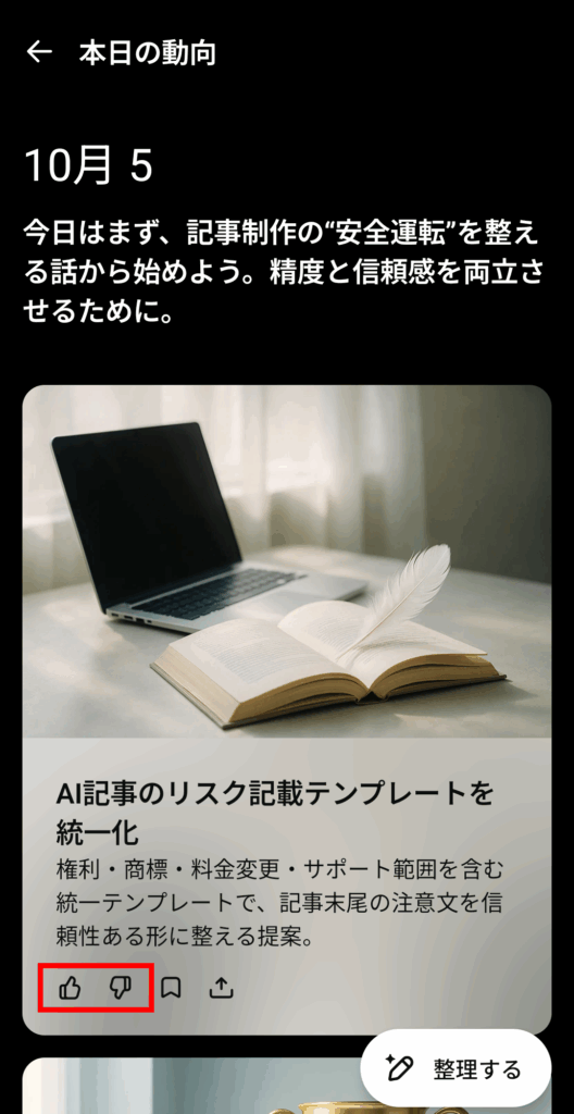 各カードには「いいね」「よくないね」といったフィードバックボタンが設置されており、ユーザーが評価を返すことでAIが好みを学習し、翌日以降の提案精度を継続的に改善していきます。
