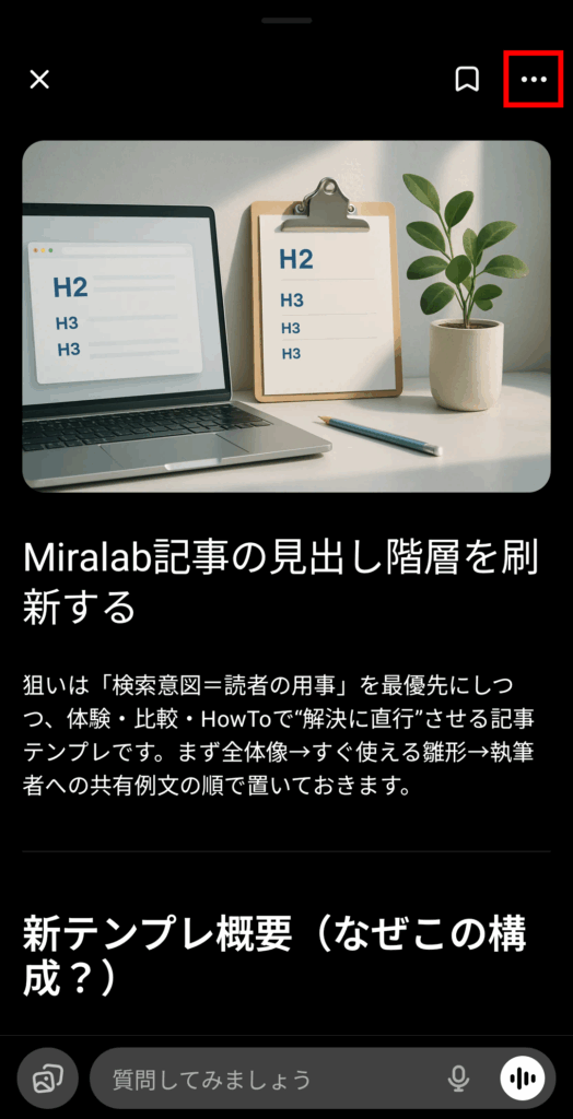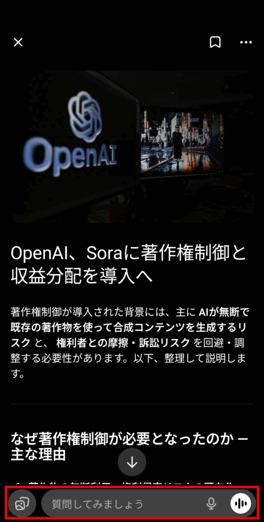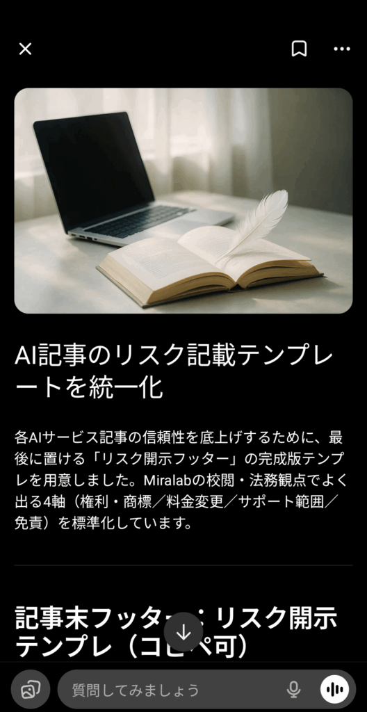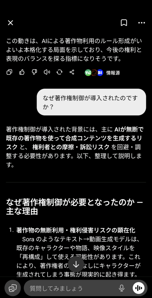 ユーザーは各カードを素早く確認したり、気になるカードを展開して詳細を読んだり、さらなる質問を投げかけて深掘りすることが可能です。