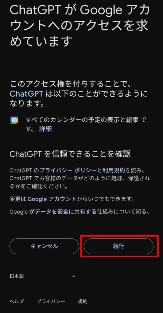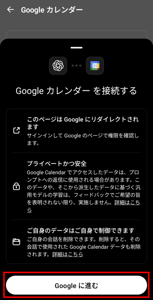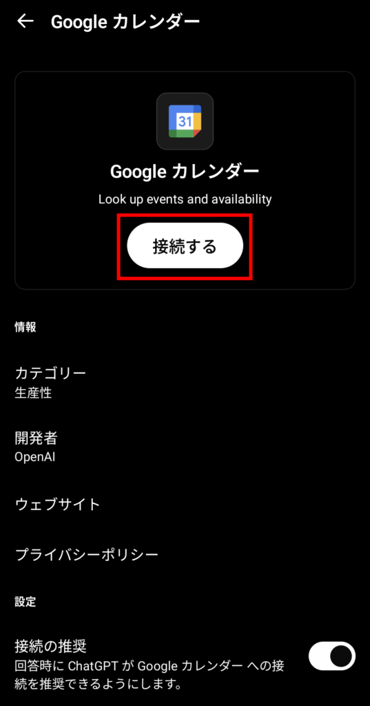 Googleカレンダーを選択し、「接続する」をタップしましょう。