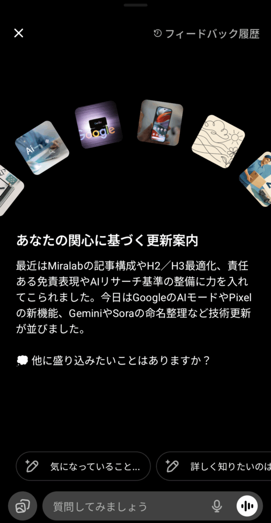 このように評価や質問を繰り返すことで、Pulseはさらにパーソナライズされた情報を提供できるようになります。