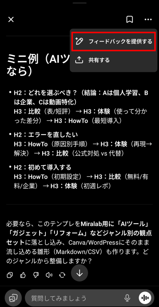 また、カードの詳細画面右上にある三点をタップして文章でフィードバックを記入することもできます。