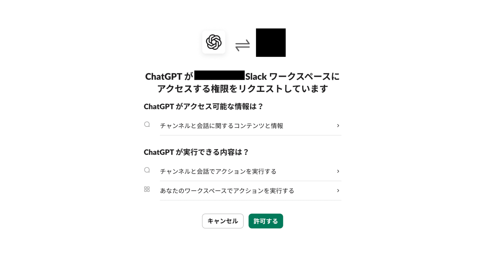 現場社員がこの操作を行った場合、ワークスペースの設定によっては管理者の承認が必要になることがあります。そのため社内全体でChatGPT app for Slackを導入する場合は、現場社員のインストールから管理者の許可の体制までのワークフローを定めておくことをお勧めします。