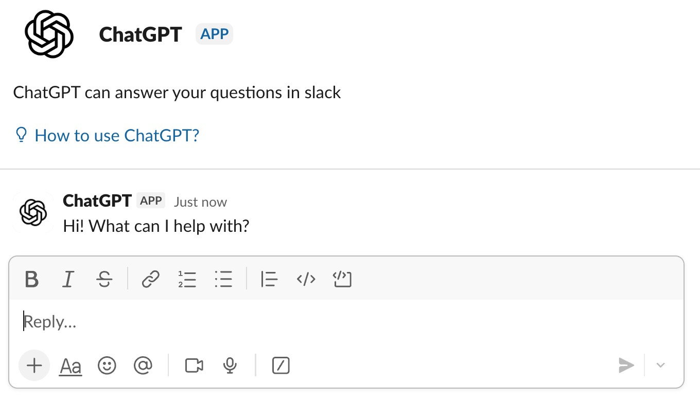 アプリの導入とコネクタの有効化が完了したら、いよいよSlack上でChatGPTの機能を活用していきます。