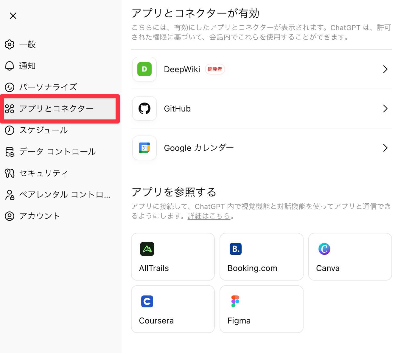 ChatGPTにログインし、左下のアカウント名から「設定」→「アプリとコネクタ」を選択。
