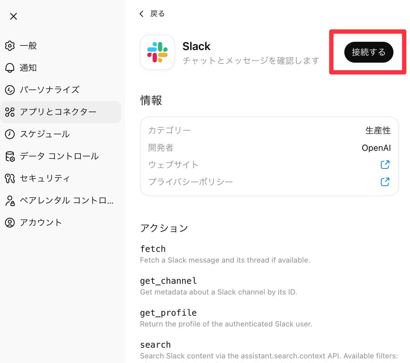 ChatGPT側でChatGPT connector for Slackを有効化し相互連携する