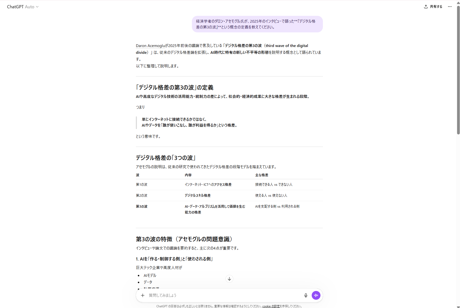 経済学者のダロン・アセモグル氏が、2025年のインタビューで語った“デジタル格差の第3の波”という概念の定義を教えてください。
