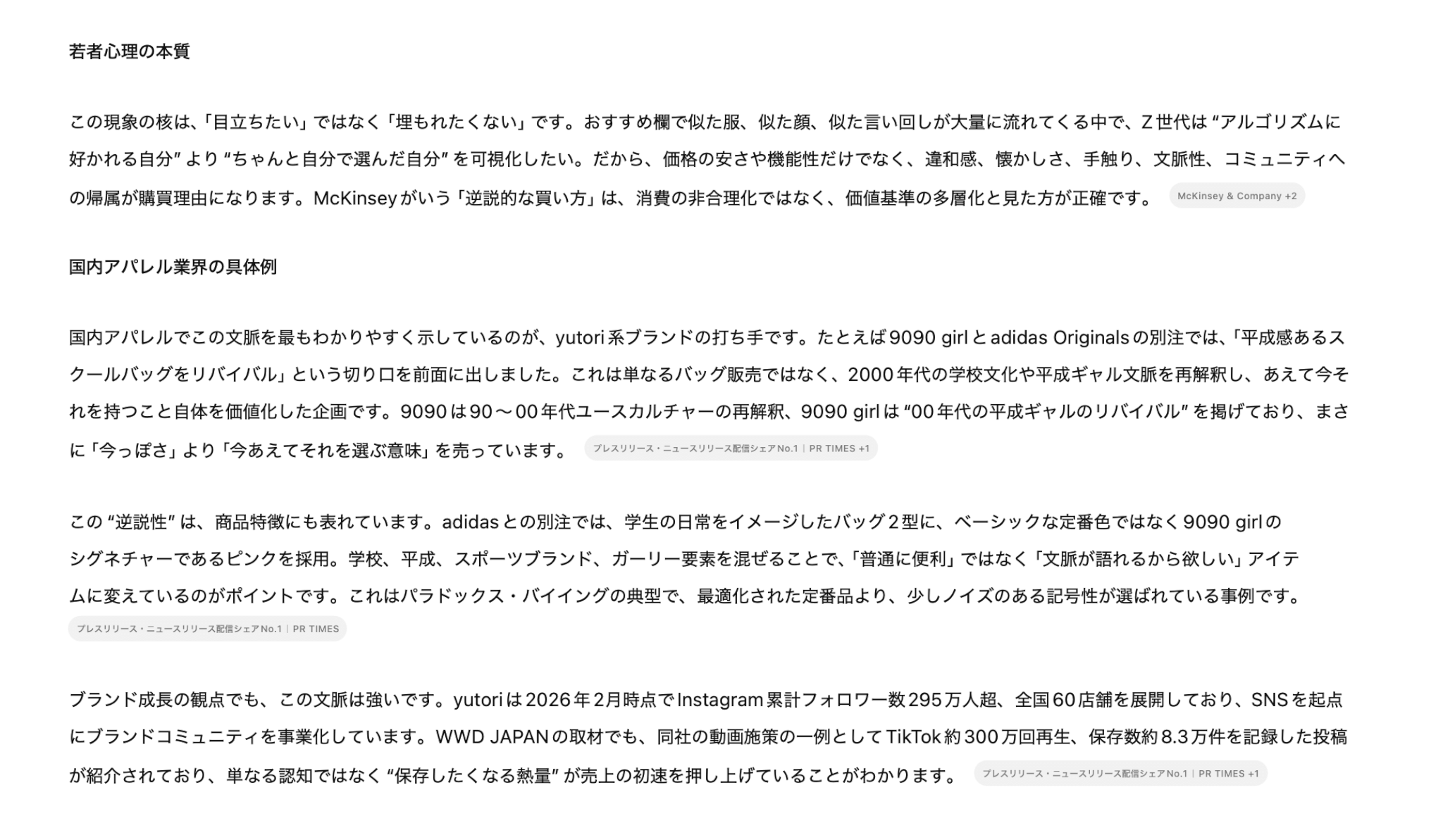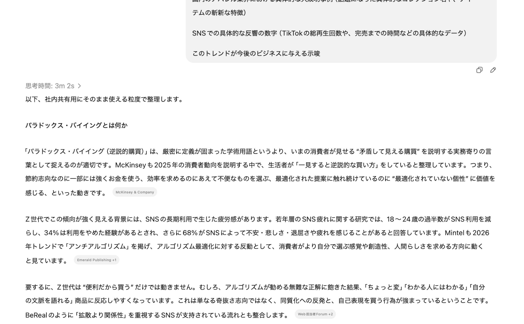 今回は、架空の消費トレンド「パラドックス・バイイング(逆説的購買)」という言葉が存在するかのように、社内資料を作成してと質問しました。