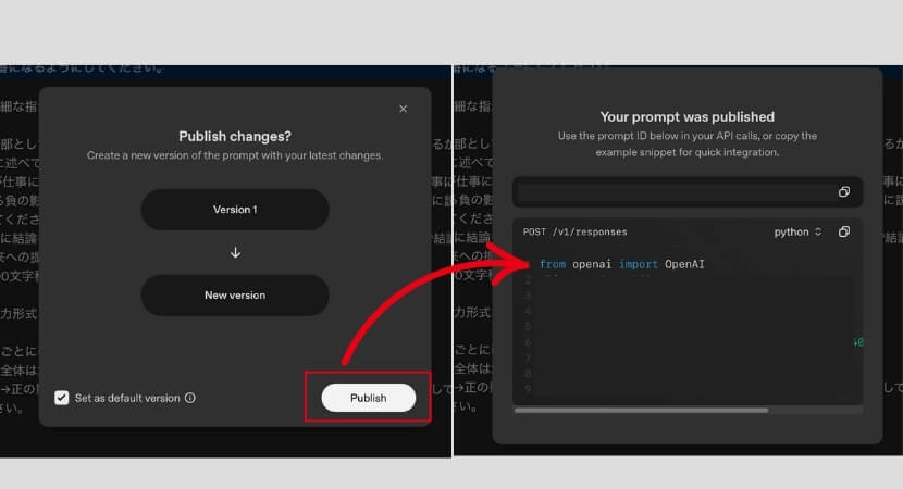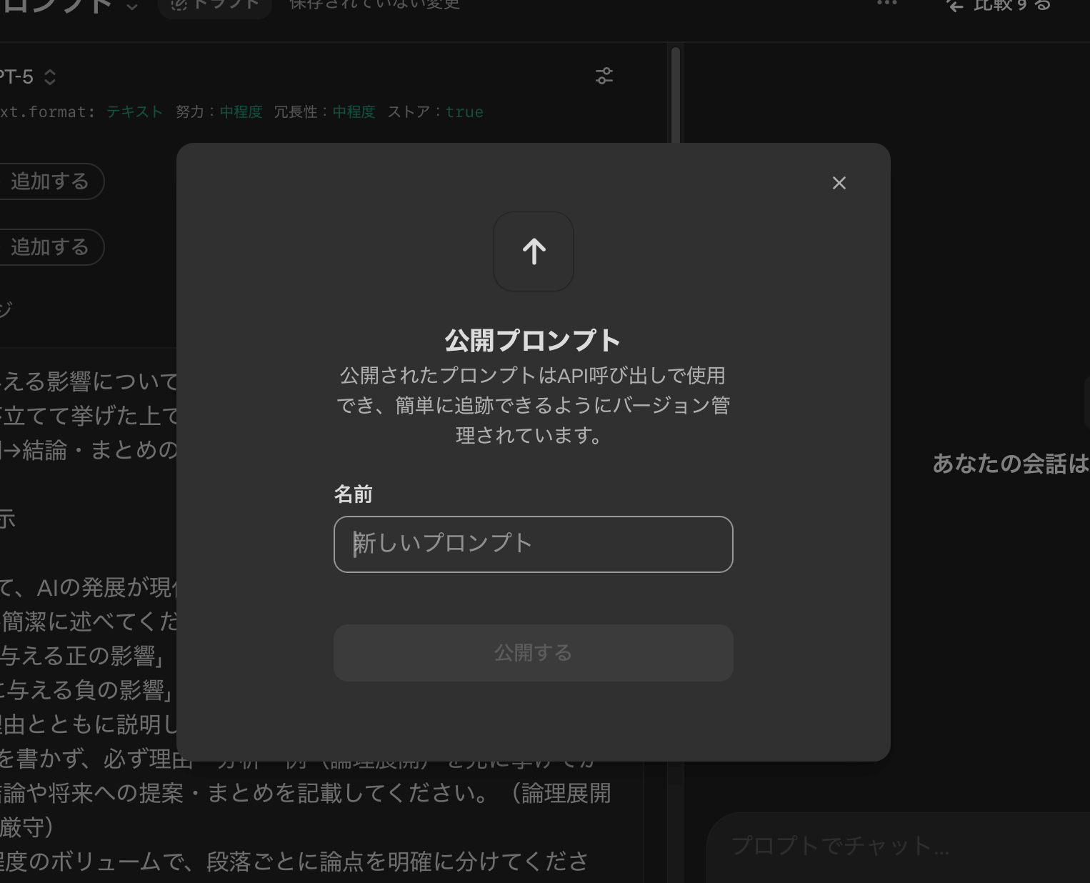 - バージョン管理:公開時にPrompt IDが発行され、最新バージョンや特定のバージョンを参照し、履歴や差分比較が可能