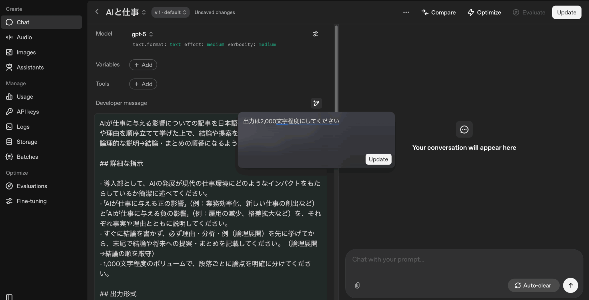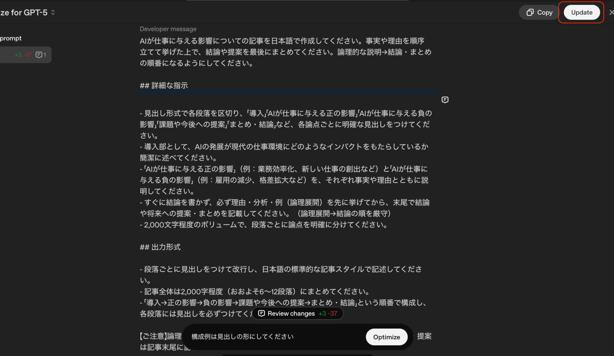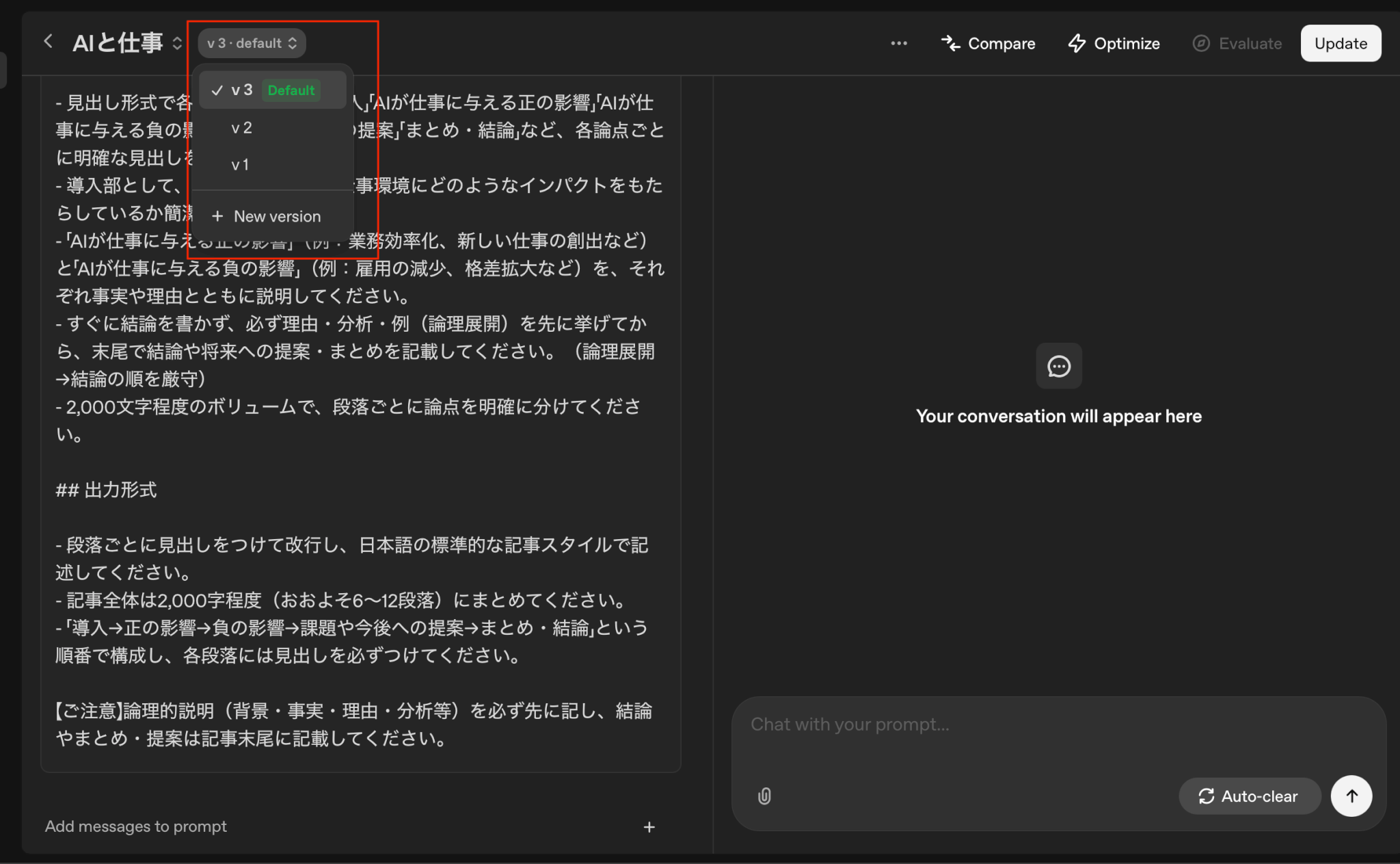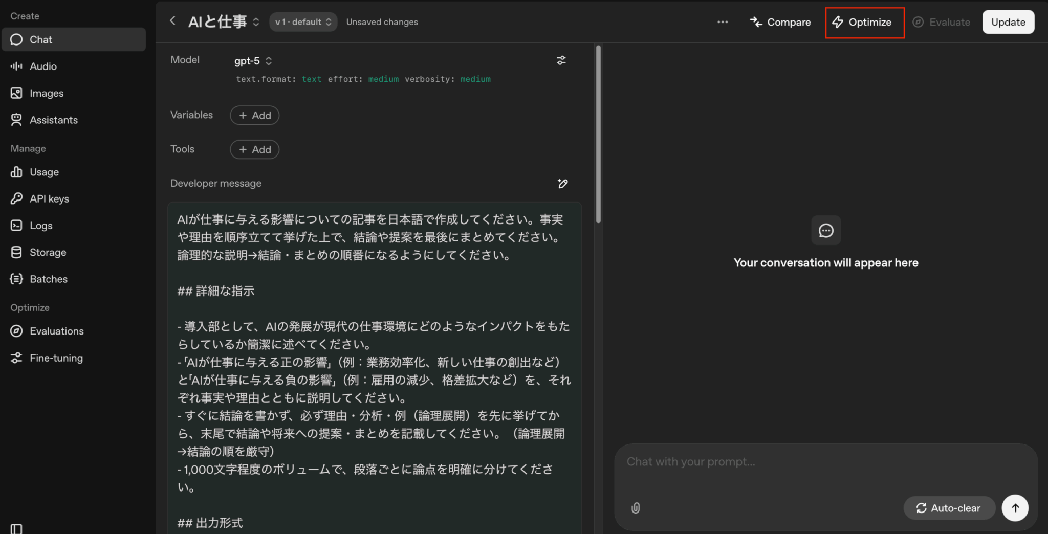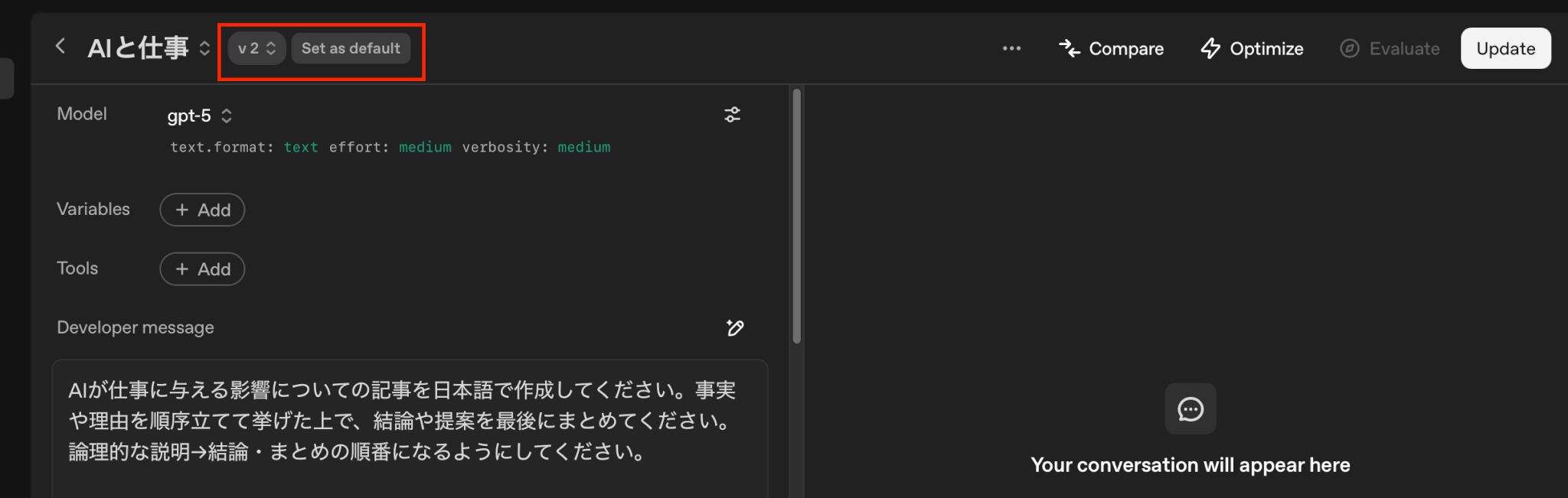 例えば、新製品のFAQ対応用にプロンプトを作成する場合、Generateで骨子を作り、Optimizeで曖昧な部分を自動修正、Evalsで想定質問への回答精度を確認し、内容をアップデートするごとにバージョン管理されるため、チーム全体で安定した活用が可能になります。