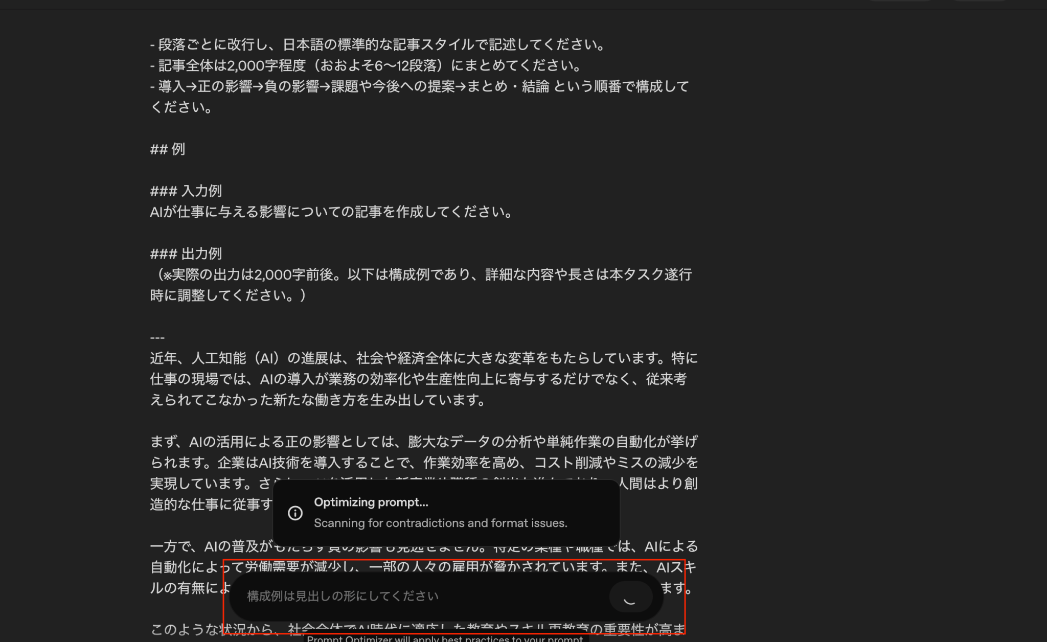 提示された改善点を反映させることで、より安定したプロンプトが生成可能です。