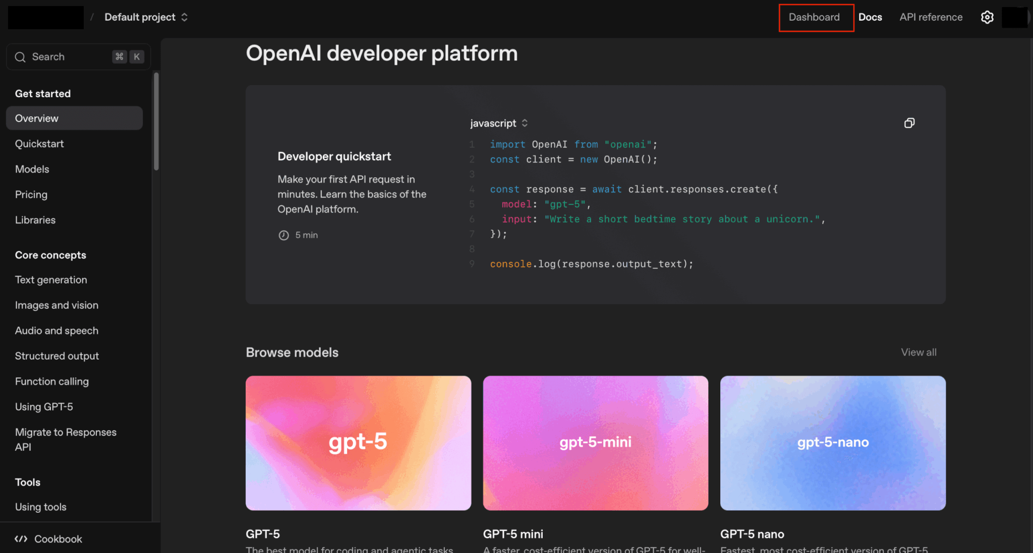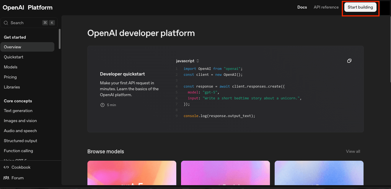 OpenAIの公式サイトからAPIプラットフォームにログインすると、API未取得のアカウントの場合、右上に「Start Building」が表示されます。「Start Building」をクリックしてセットアップを始めましょう。
