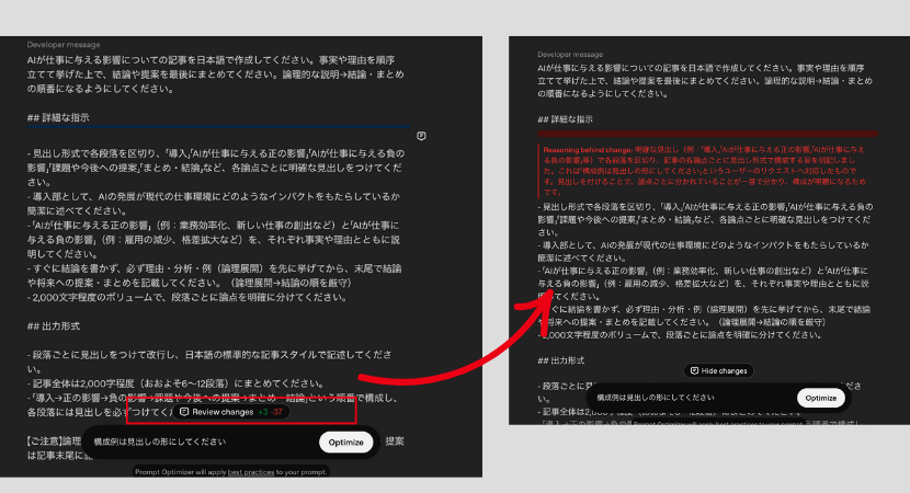 - Optimize(改善):矛盾点や曖昧な表現を検出し、改善案を提示