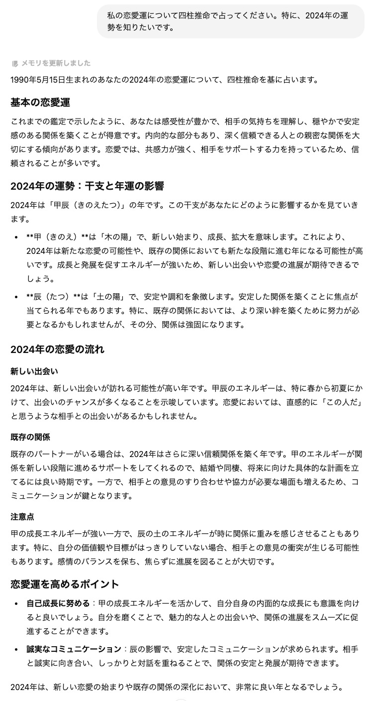 生年月日を入力するだけで、ChatGPTは四柱推命に関する一般的なデータをもとに、性格傾向や人生全般の運勢を示唆する内容を提供します。