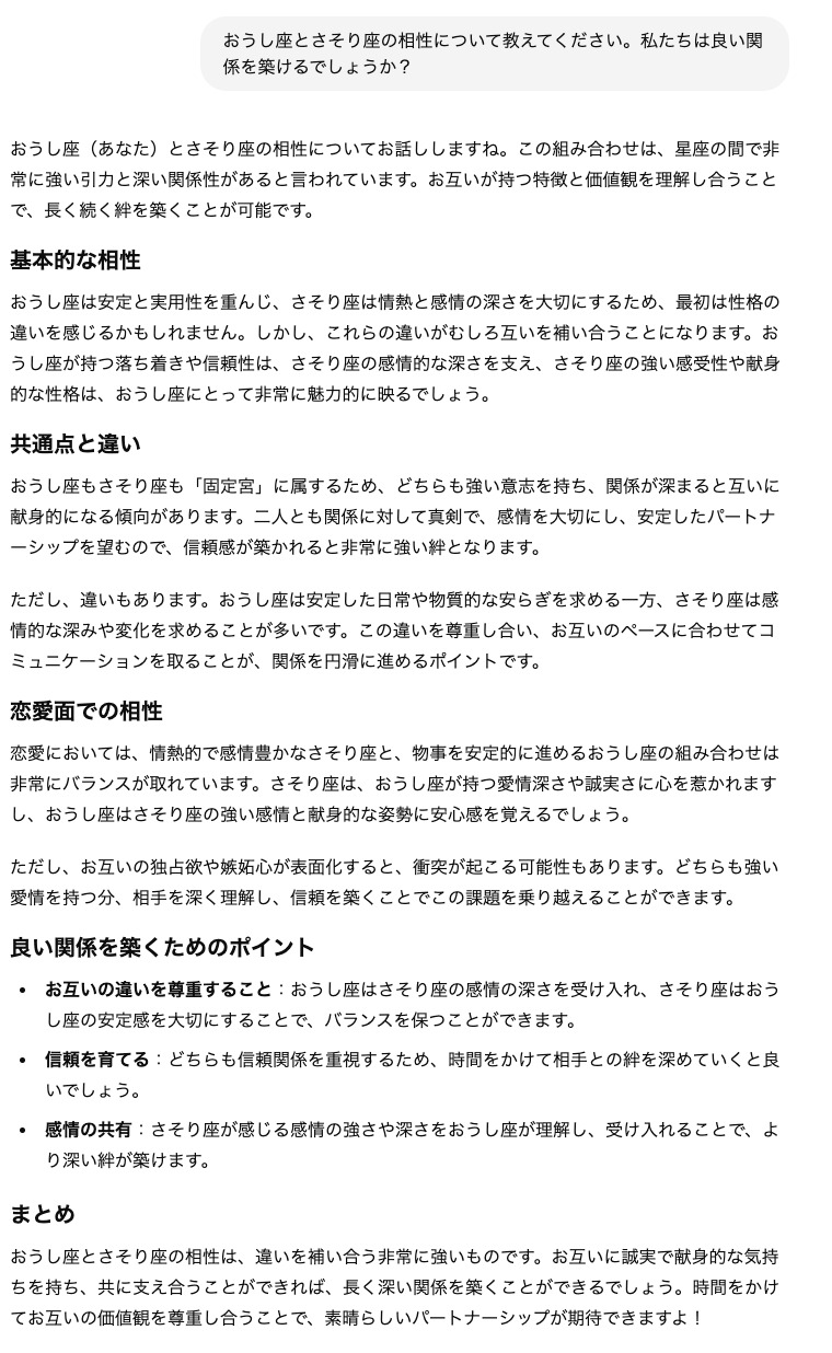 占いのプロンプトを適切に設定することで、まるで占い師に相談しているかのような体験が得られるのです。