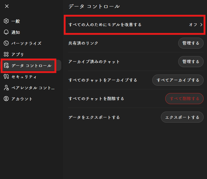 設定を開いて、左側メニューから「データ コントロール」を開きます。その中に「すべての人のためにモデルを改善する」という項目があるので、クリックしましょう。