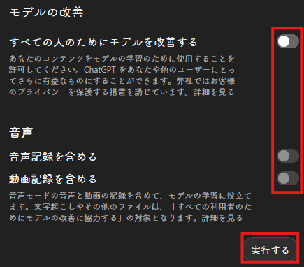 モデルの改善というポップアップメニューが出てきます。各項目をオフにし、「実行する」をクリックしましょう。