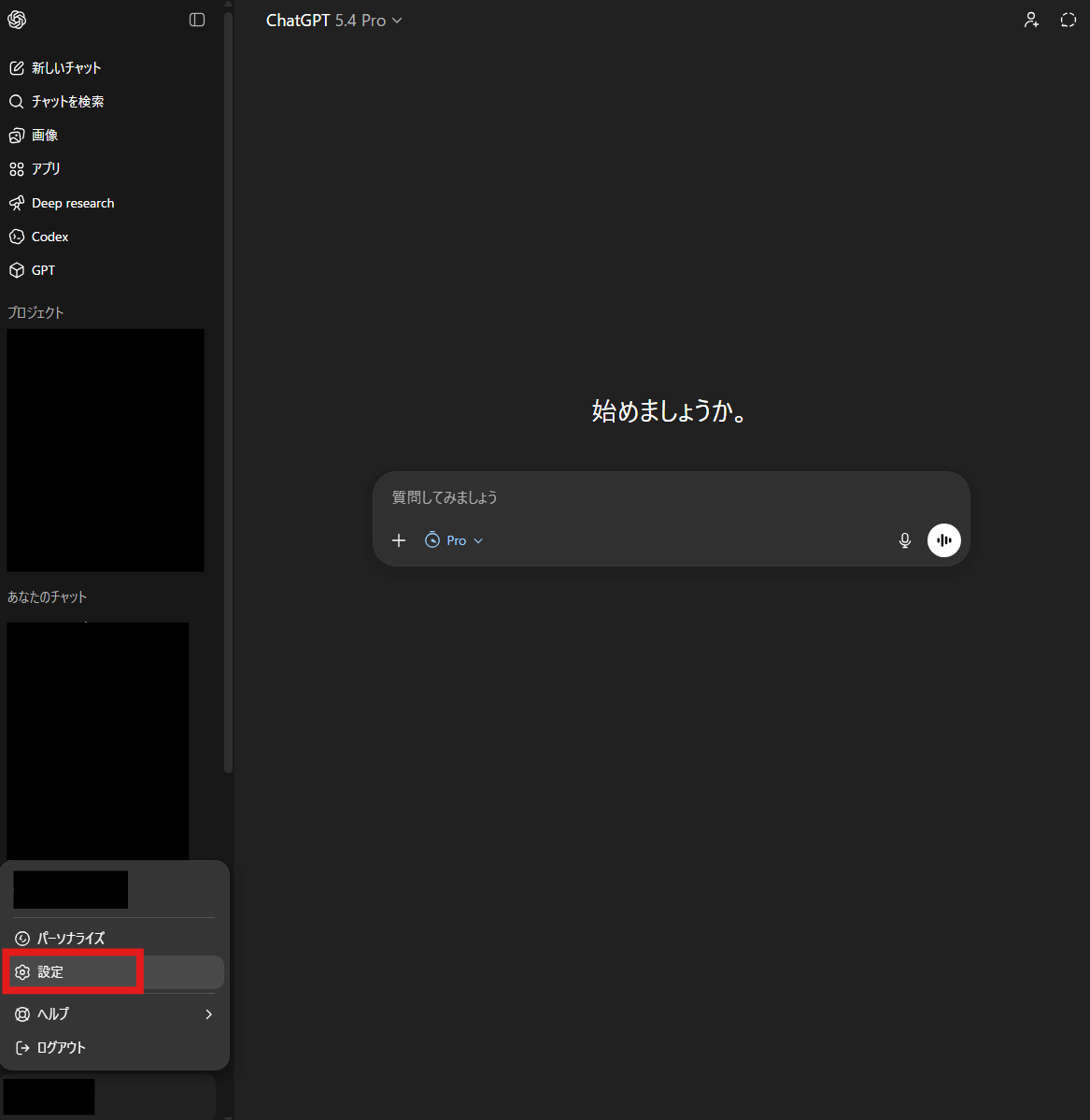 ChatGPT左下のアカウントをクリックし、設定画面を開きましょう。