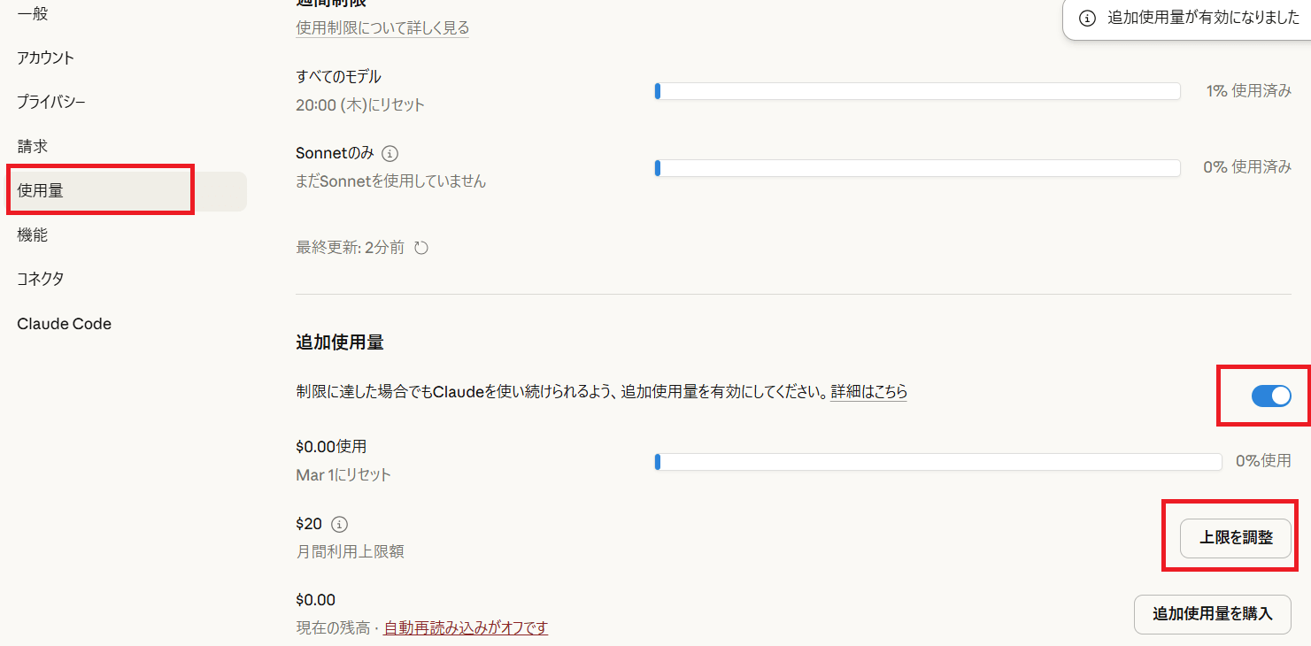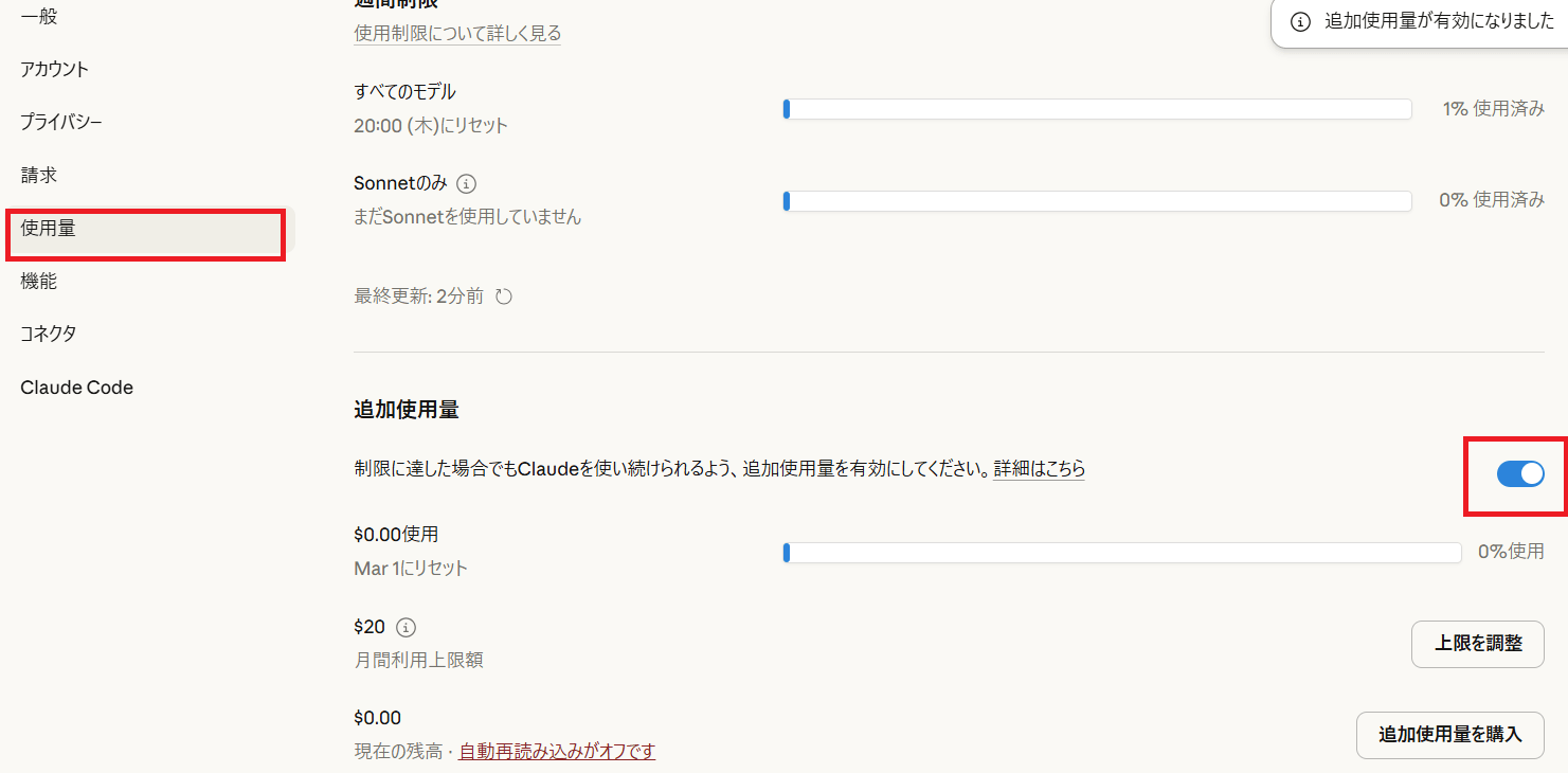 追加使用量設定を有効にする方法は下記の通りです。