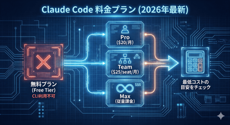 ブラウザ版やアプリで利用可能な「Freeプラン(無料枠)」は、CLIツールであるClaude Codeには適用されないためです。 利用には、月額固定のサブスクリプション契約(Pro/Max/Team)を行うか、APIの従量課金設定を済ませたアカウントが必要となります。