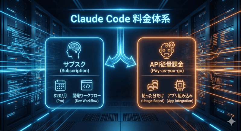 Claude Codeの課金は「月額定額(サブスク)」と「使った分だけ払う(API従量課金)」の2つに大別されます。これらを単独で使うか、組み合わせて使うかがコスト管理の鍵となります。