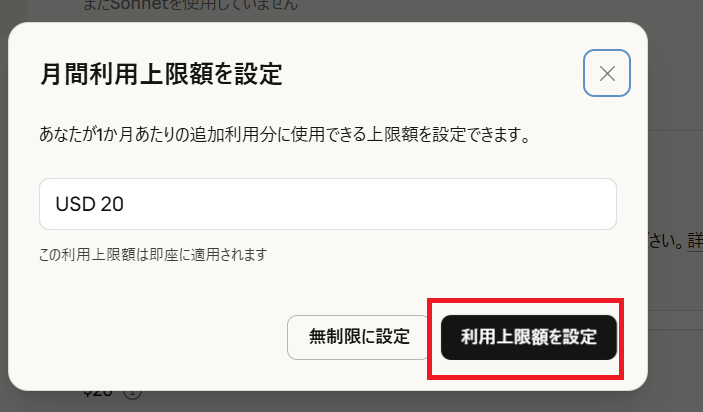 任意の上限金額を入力し、「利用上限額を設定」をタップします。金額はドルでしか入力ができないため、注意が必要です。